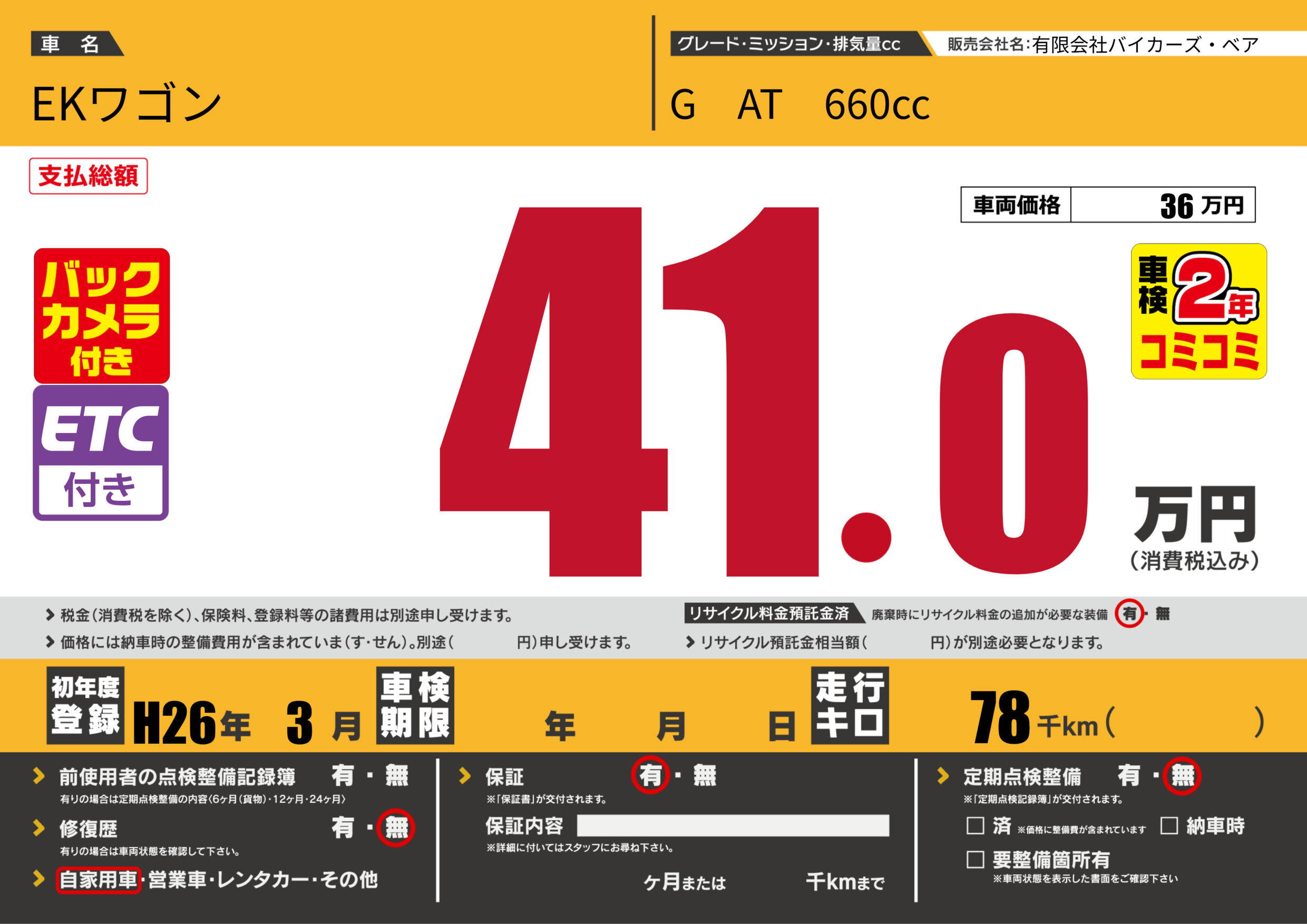 | 走行キロ | 7.8万km | 初年度登録 | H26年3月 |