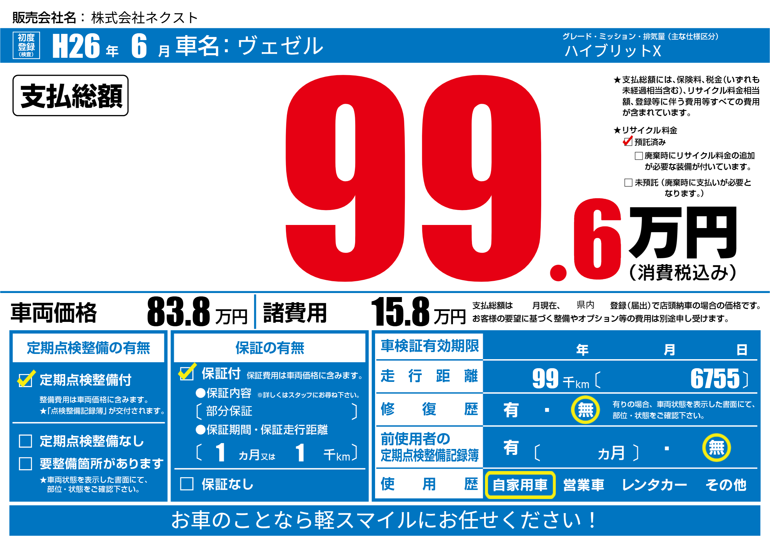 | 走行キロ | 9.9万km | 初年度登録 | H26年6月 |