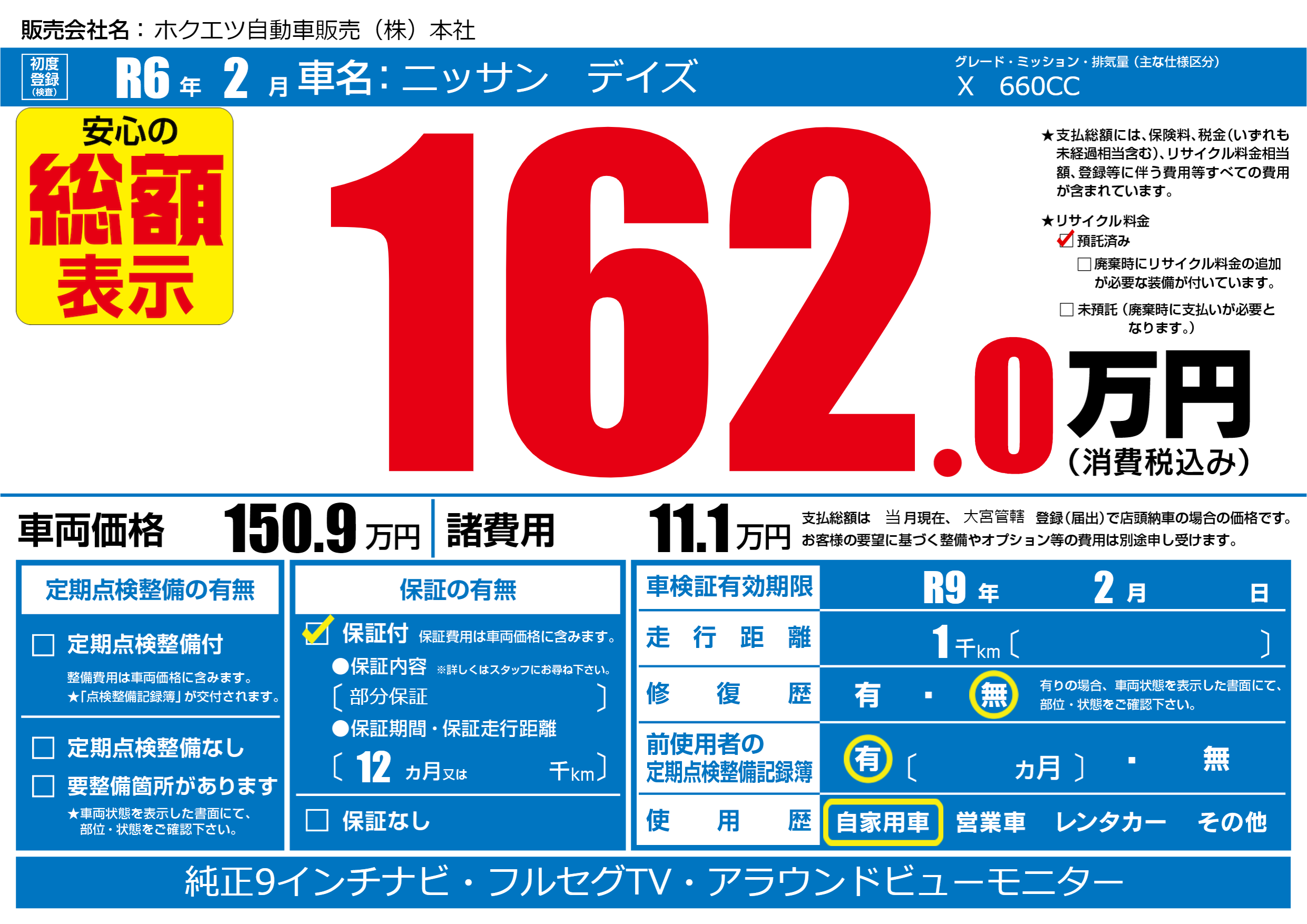 | 車名 | ニッサン デイズ | グレード ミッション 排気量 |