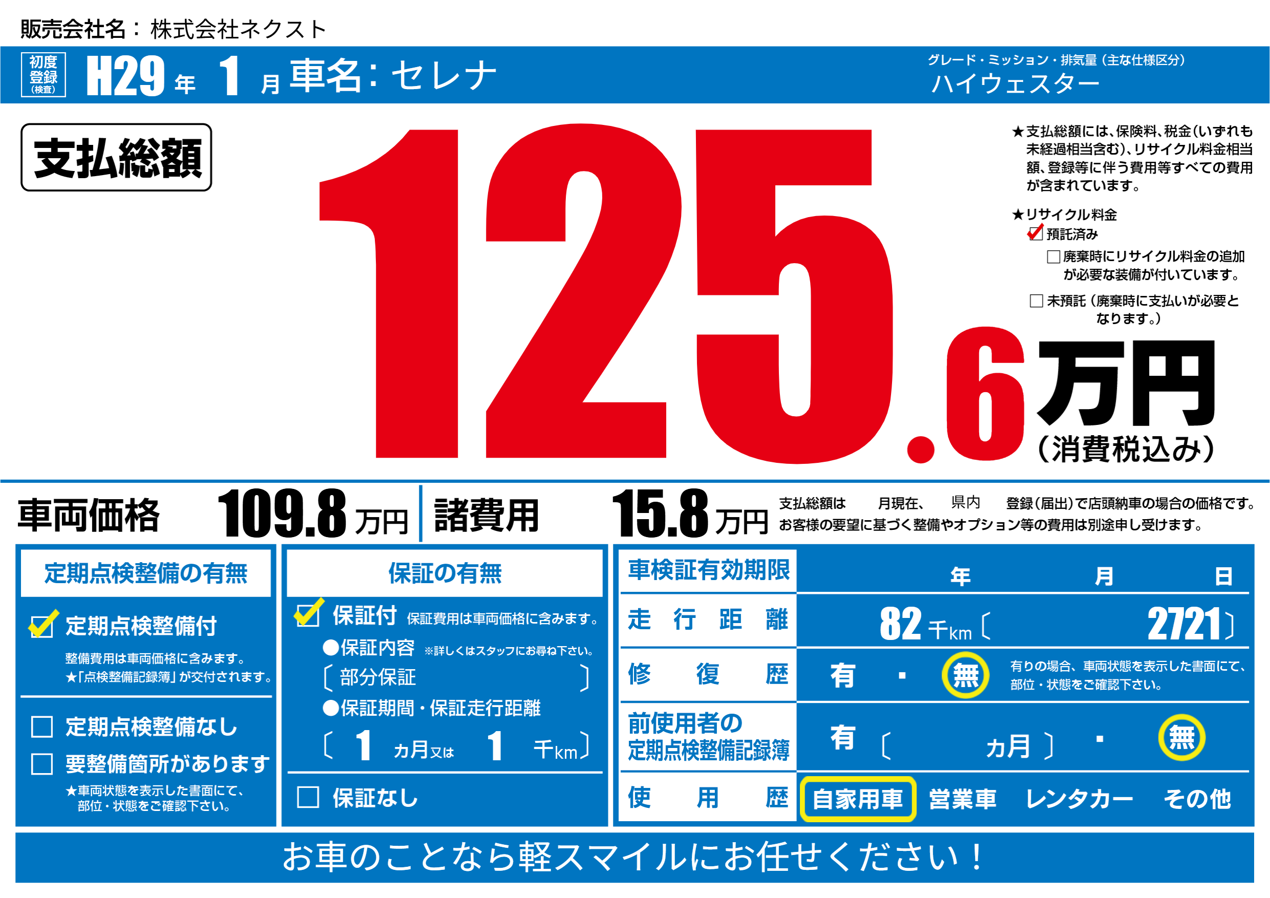 | 車名 | セレナ | グレード ミッション 排気量 |