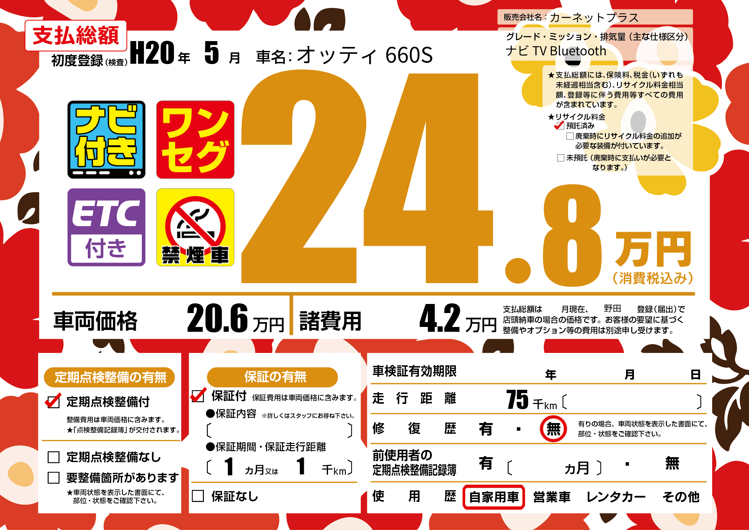 | 車名 | オッティ 660S | グレード ミッション 排気量 |