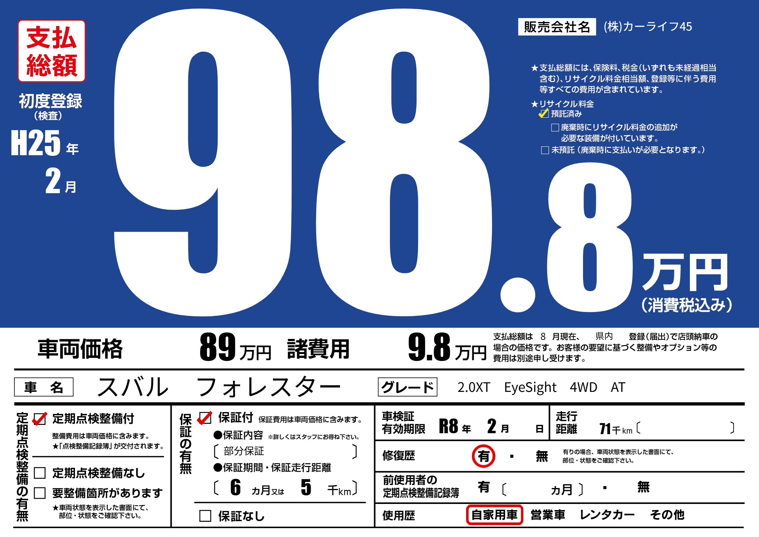 | 車名 | スバル フォレスター | グレード ミッション 排気量 |