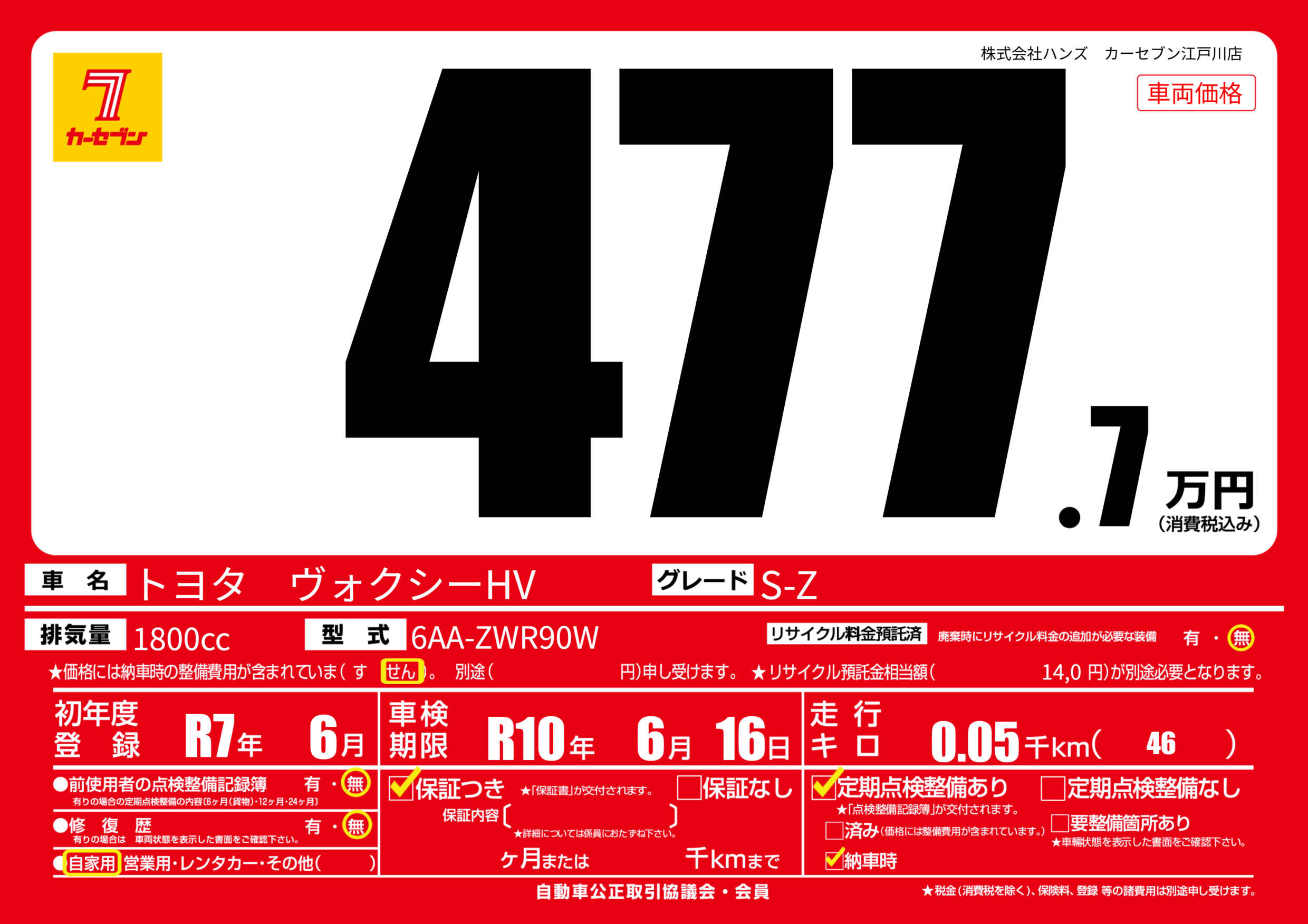 | 走行キロ | - | 初年度登録 | R7年6月 |