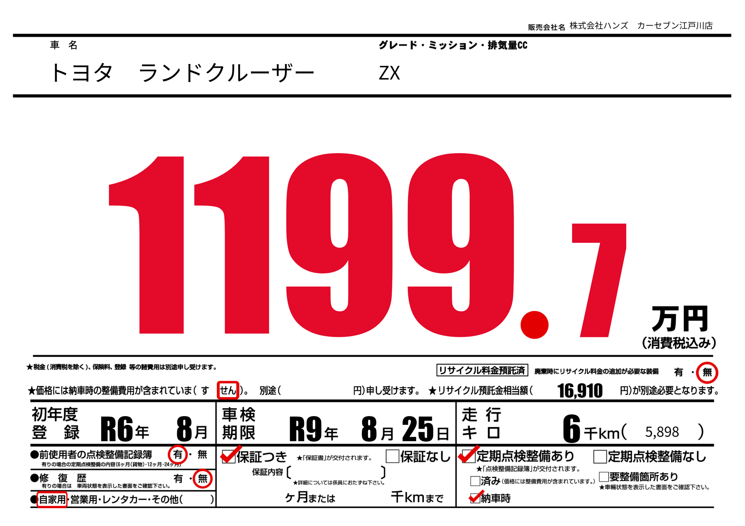 なし | 車検制限 | R9年8月25月 |