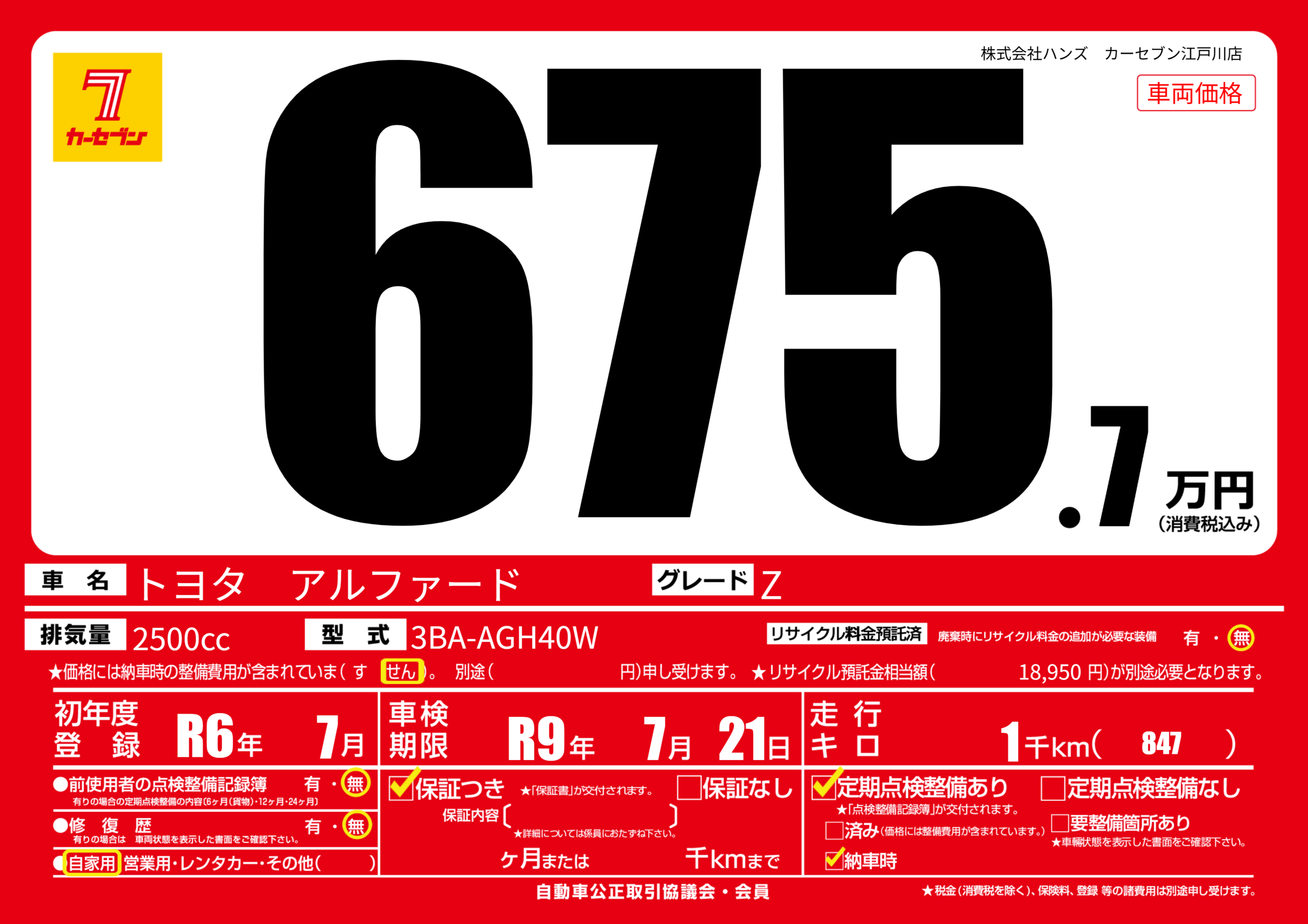 | 走行キロ | 0.1万km | 初年度登録 | R6年7月 |