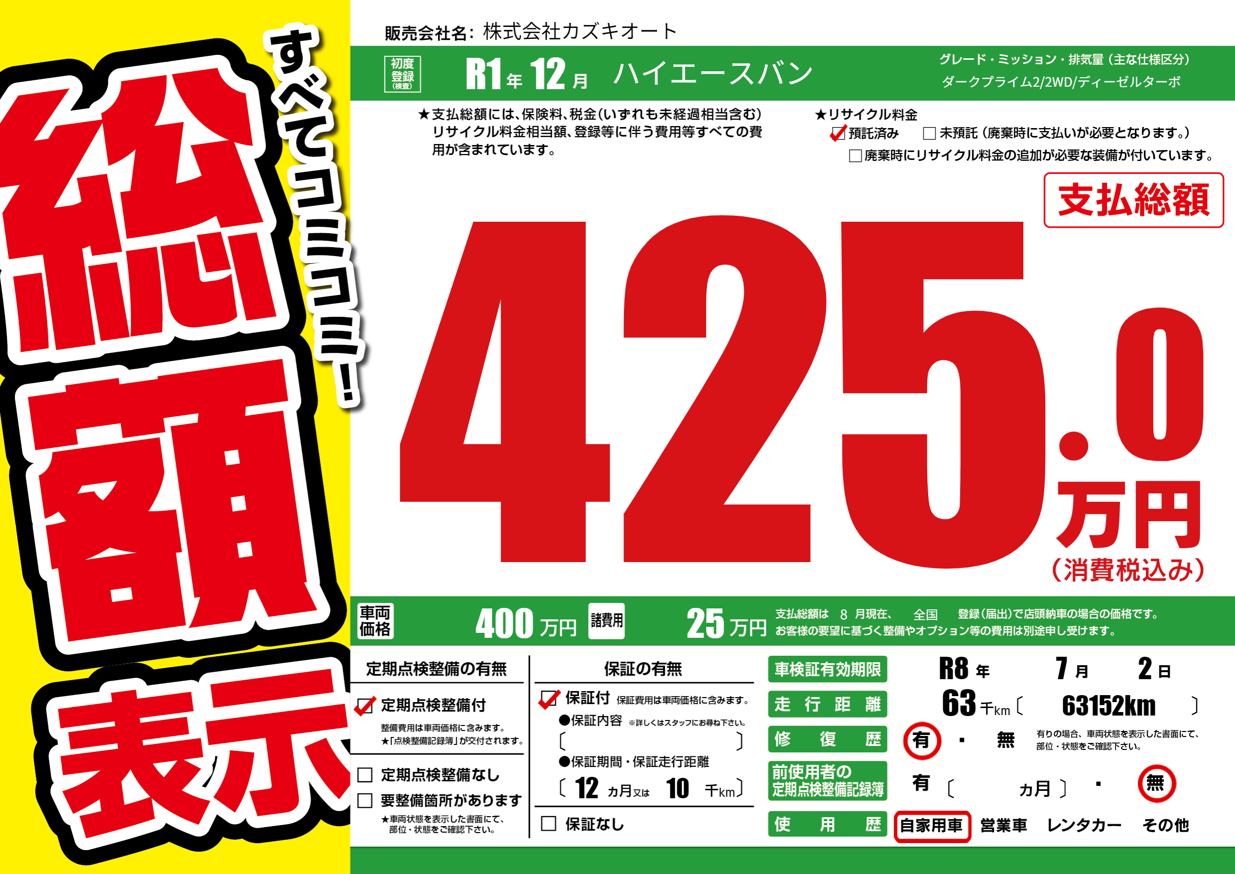 | 車名 | ハイエースバン | グレード ミッション 排気量 |