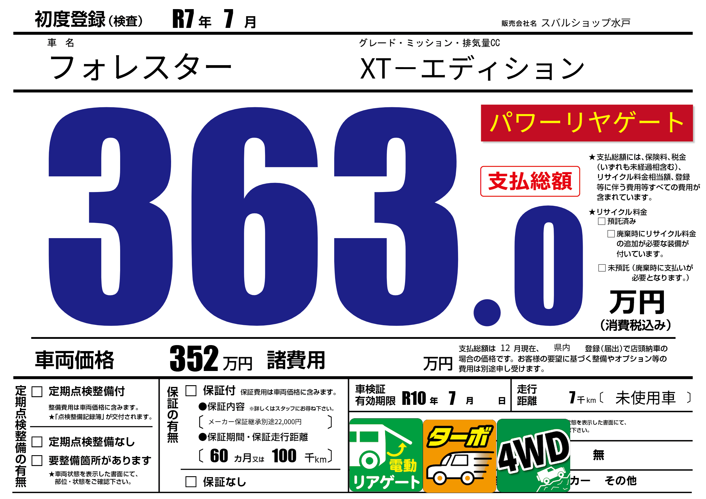 | 車検制限 | R10年 7月 - 日 | ||