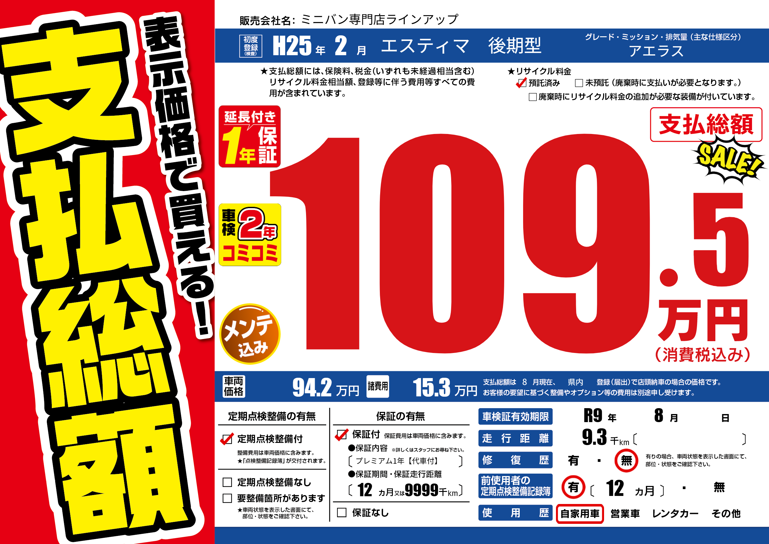 | 車名 | エスティマ 後期型 | グレード ミッション 排気量 |