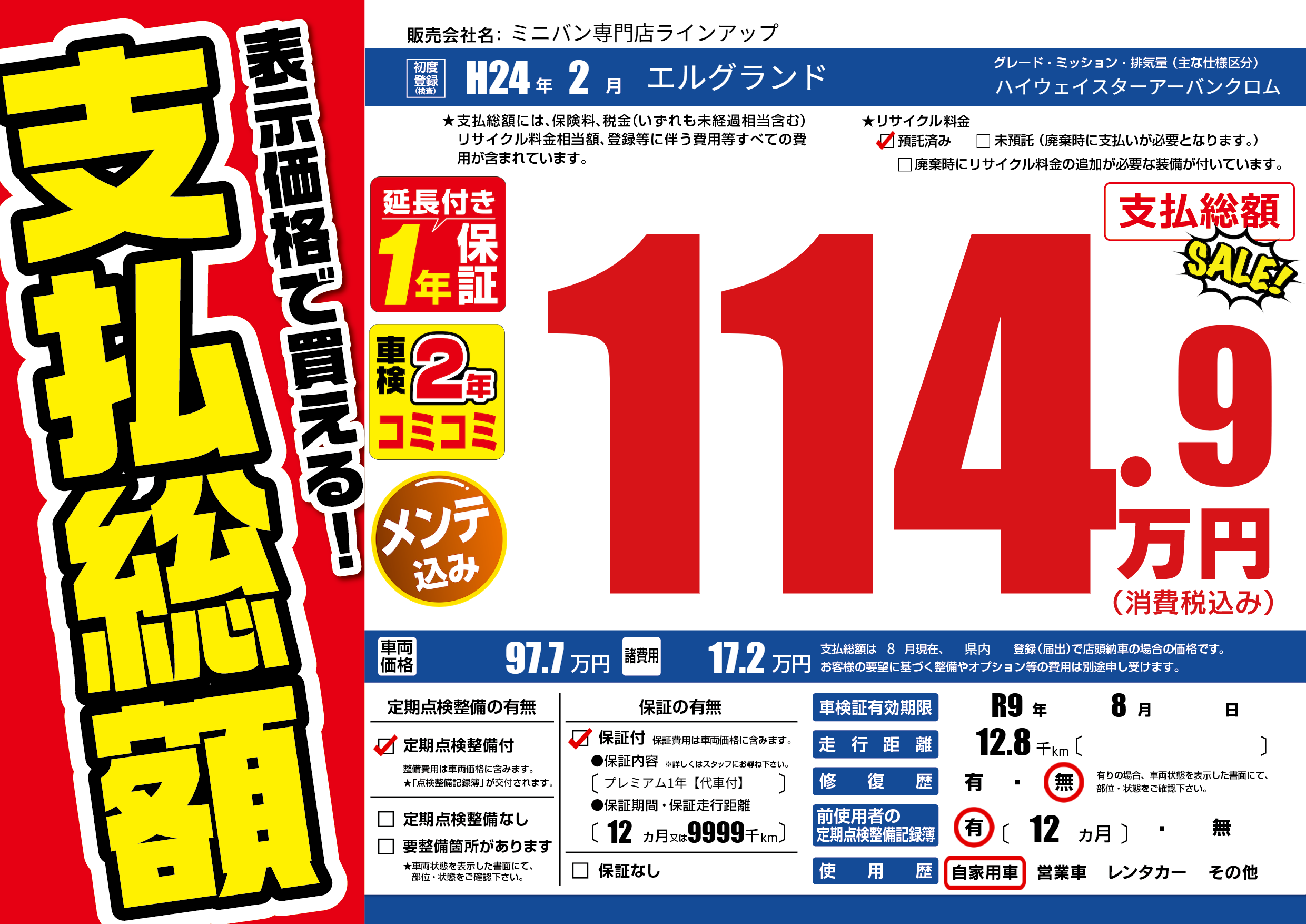 | 車検制限 | R9年 8月 - 日 | ||