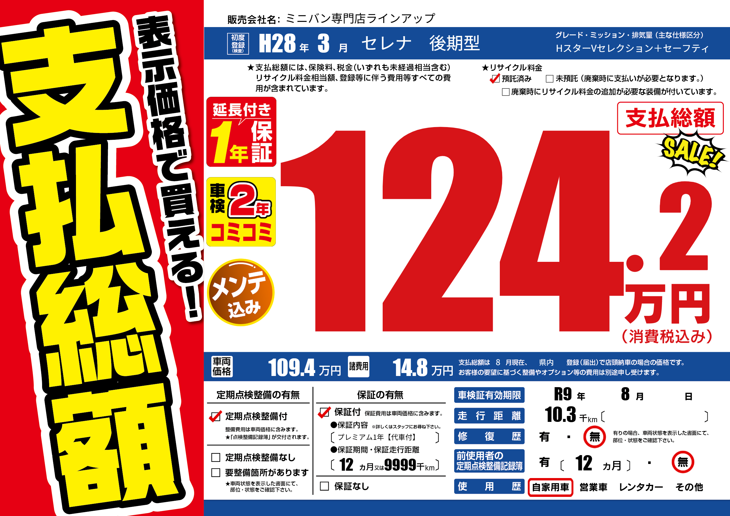 | 車名 | セレナ 後期型 | グレード ミッション 排気量 |