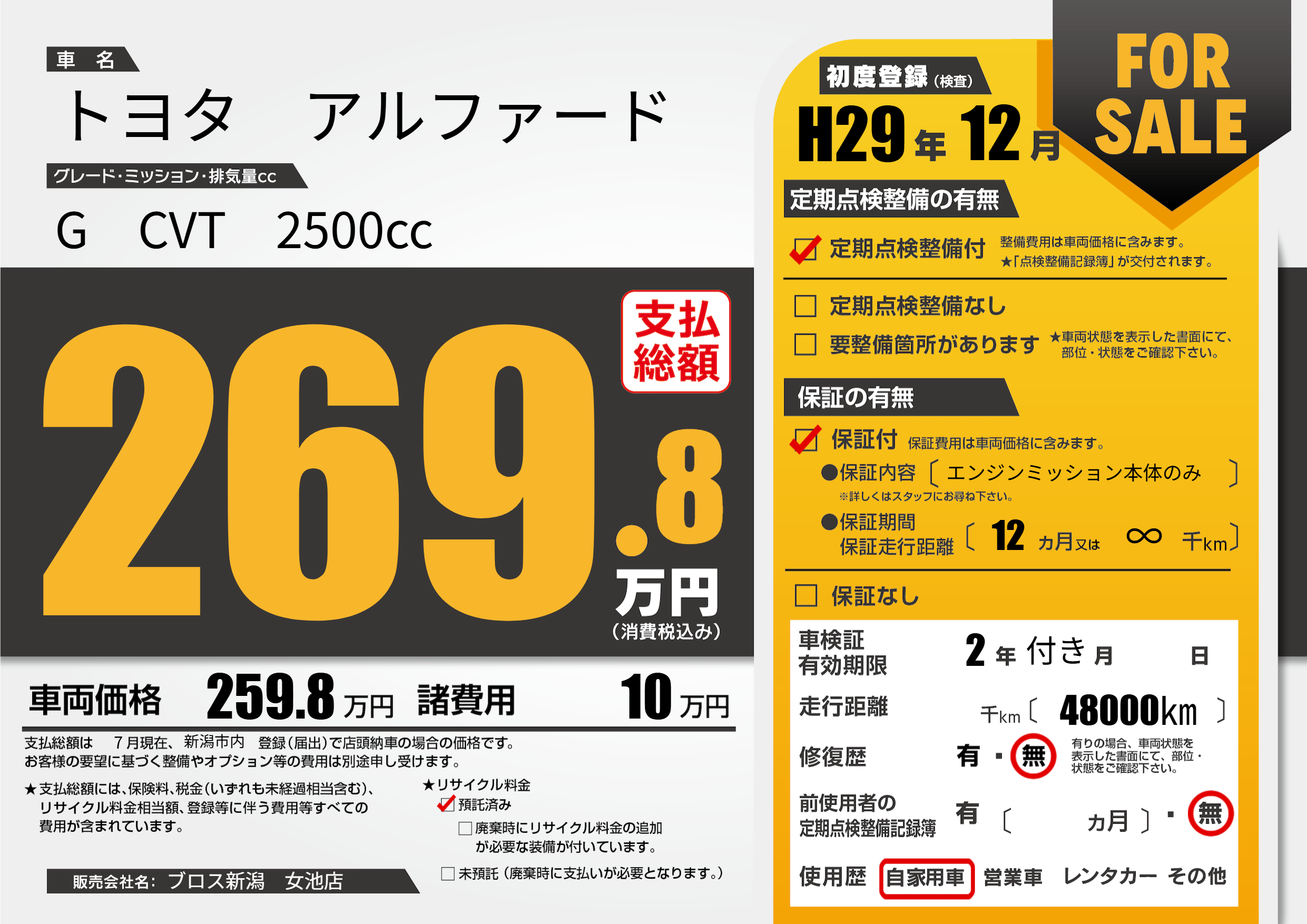 | 車名 | トヨタ アルファード | グレード ミッション 排気量 |
