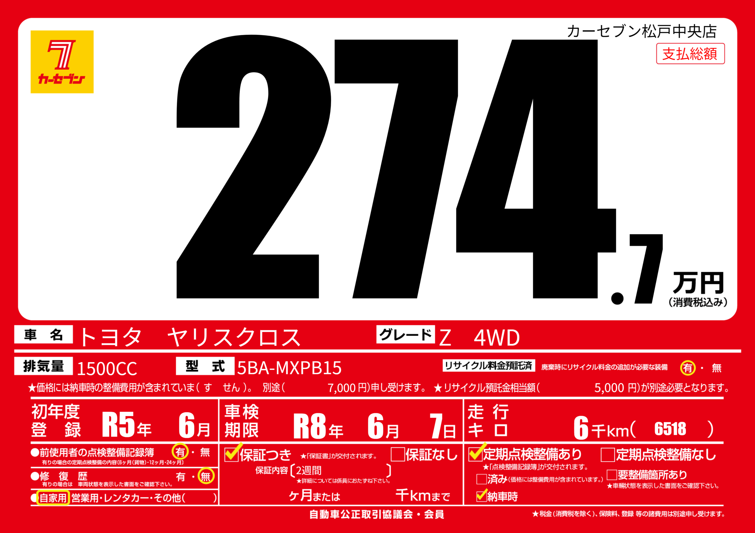 | 車名 | トヨタ ヤリスクロス | グレード ミッション 排気量 |