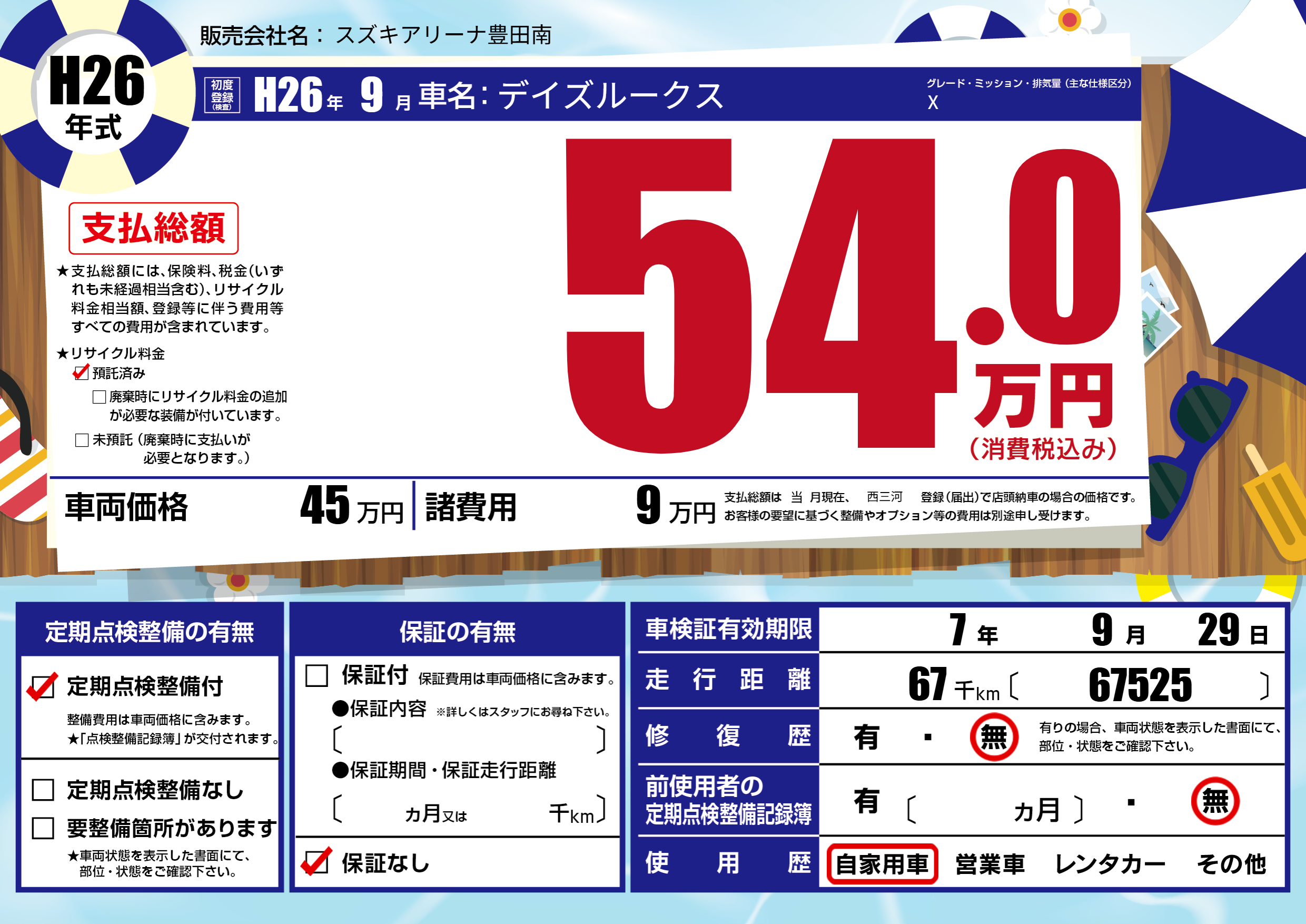 | 走行キロ | 6.7万km | 初年度登録 | H26年9月 |