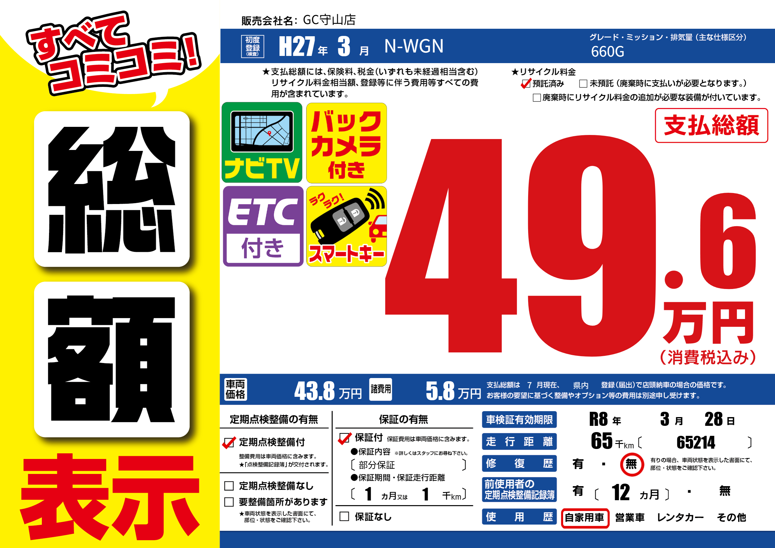 | 車名 | N-WGN | グレード ミッション 排気量 |