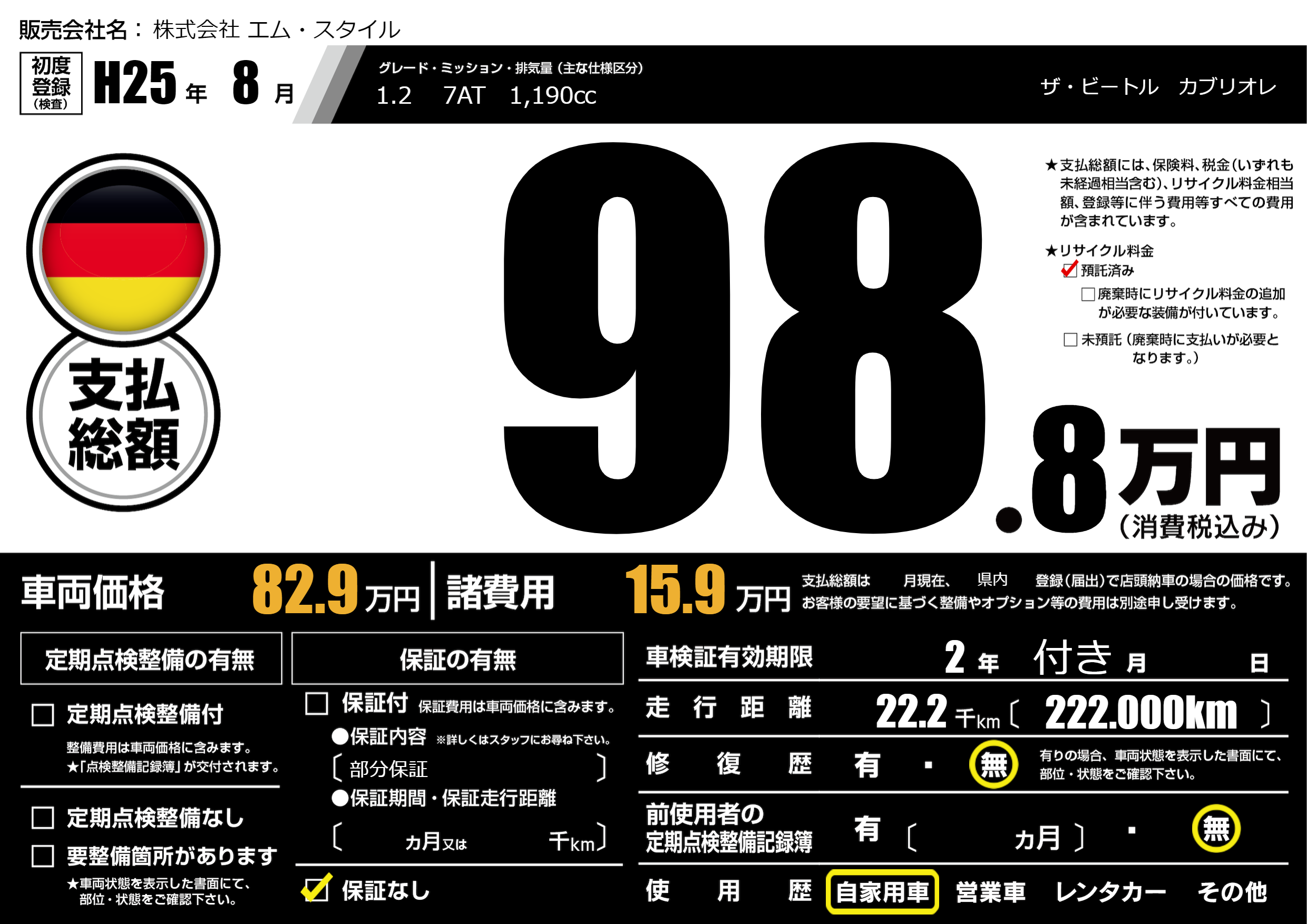 | 車名 | ザ・ビートル カブリオレ | グレード ミッション 排気量 |