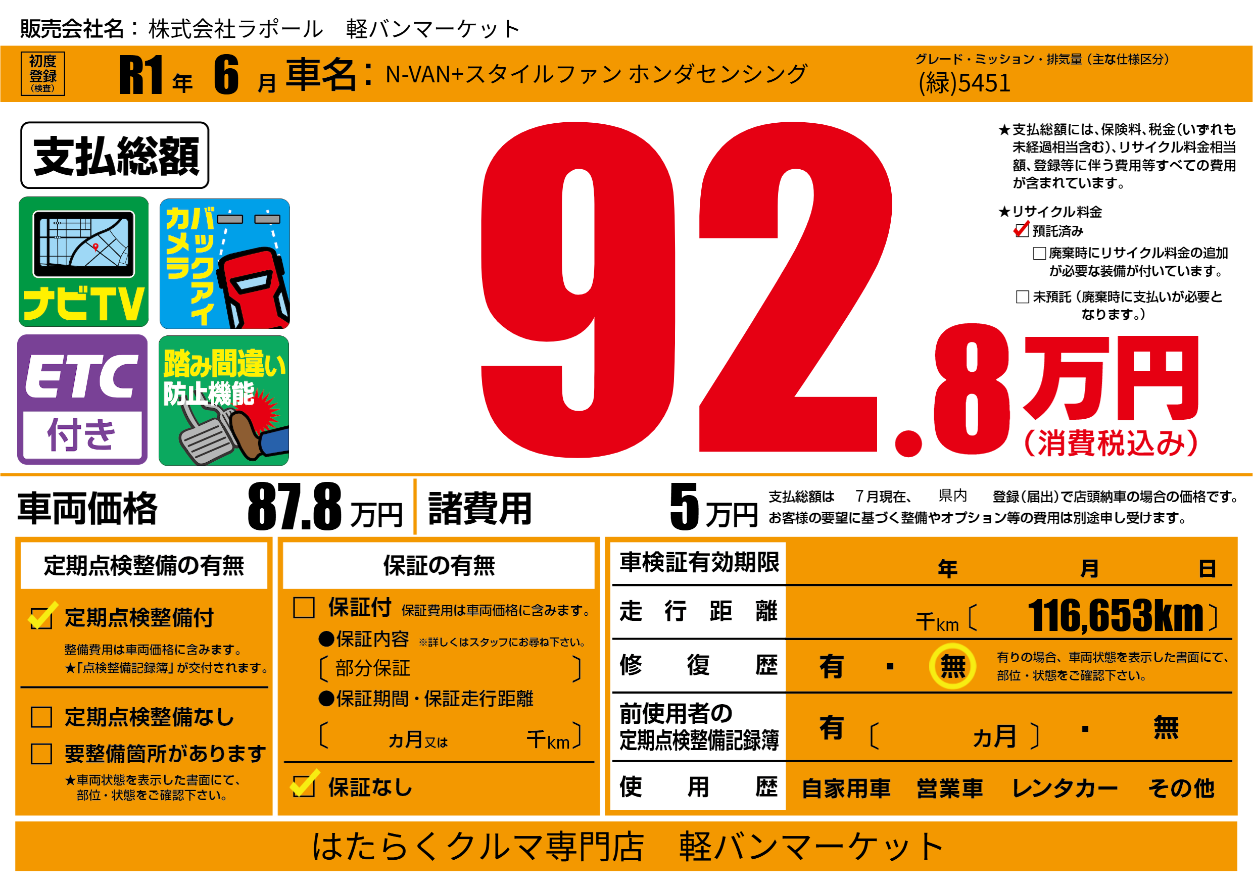 | 車名 | N-VAN+スタイルファン ホンダセンシング | グレード ミッション 排気量 |