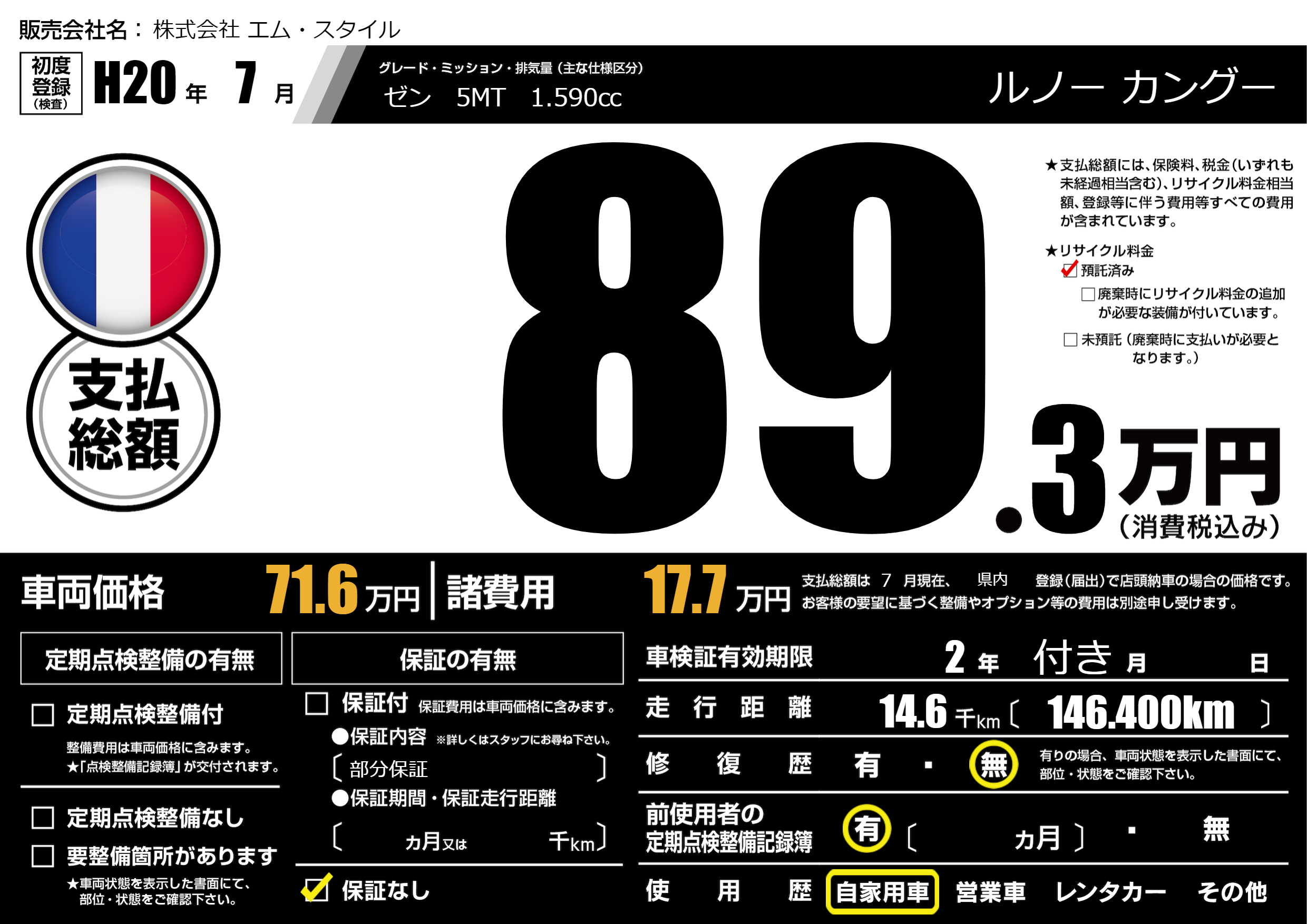 | 車名 | ルノー カングー | グレード ミッション 排気量 |