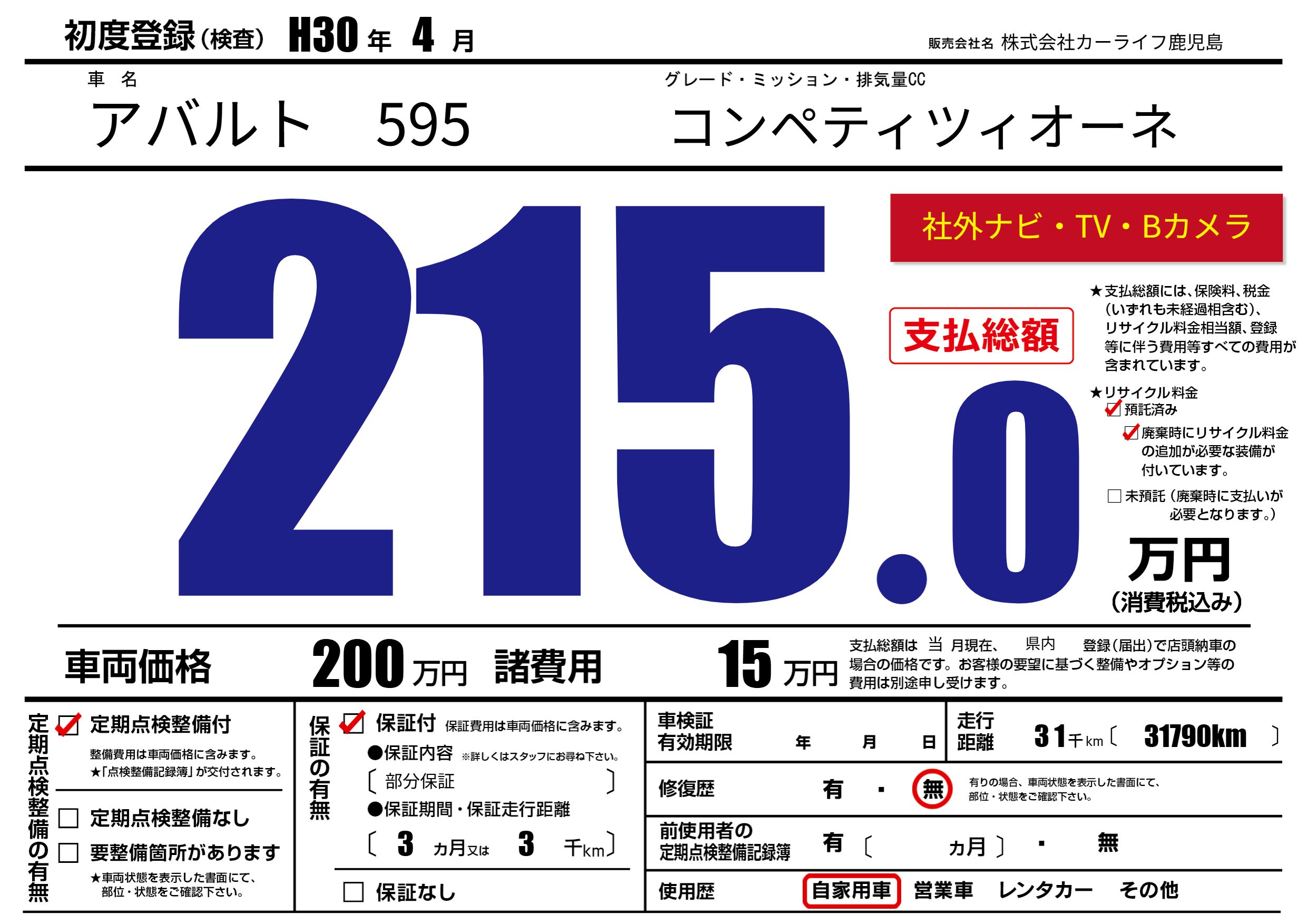 | 車名 | アバルト 595 | グレード ミッション 排気量 |