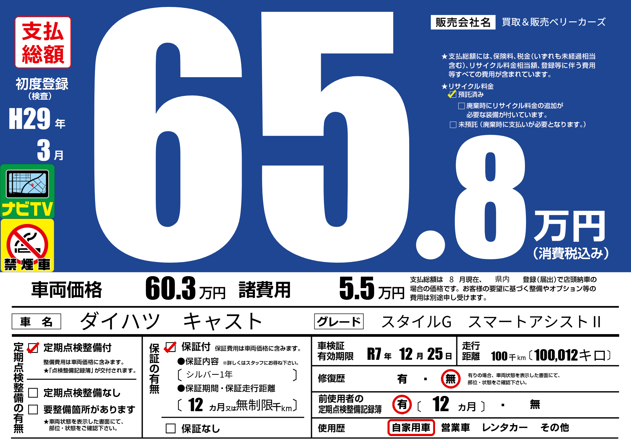 | 走行キロ | 10万km | 初年度登録 | H29年3月 |