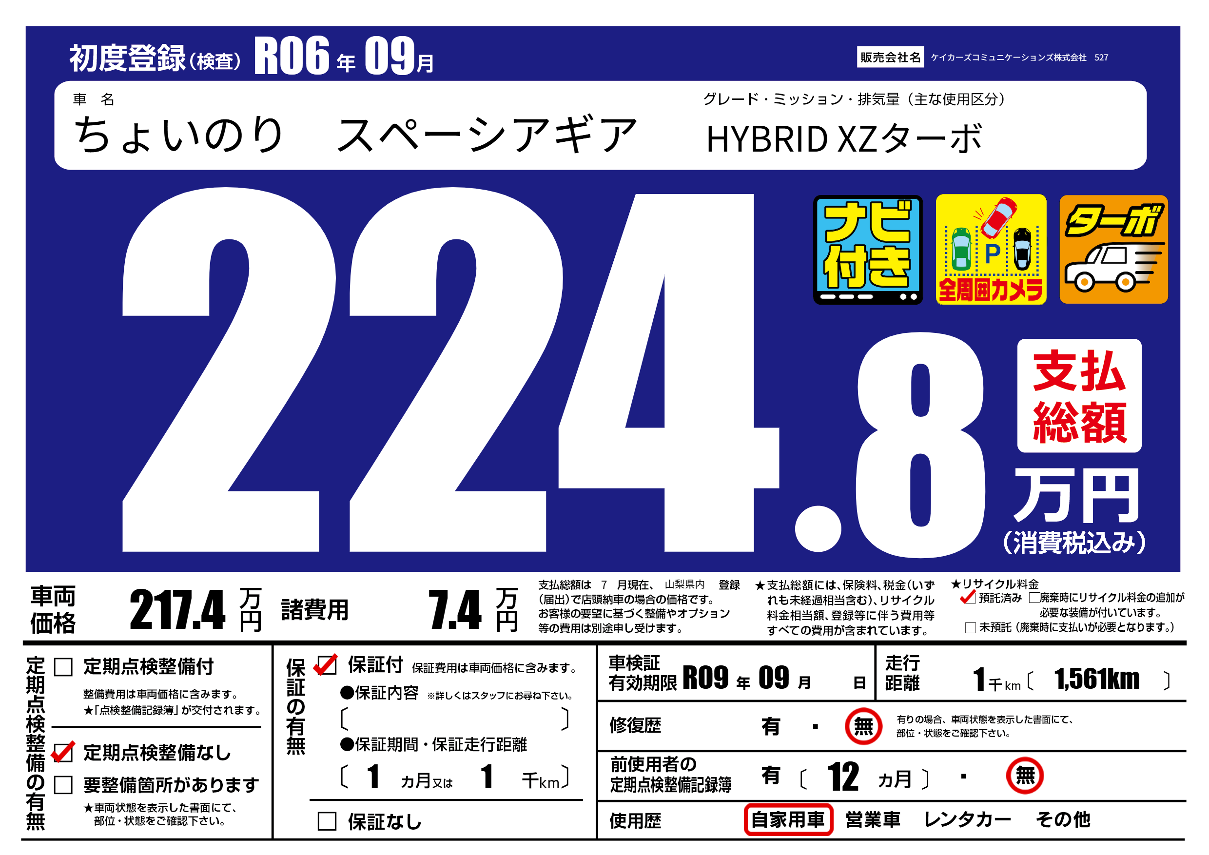 | 走行キロ | 0.1万km | 初年度登録 | R06年09月 |