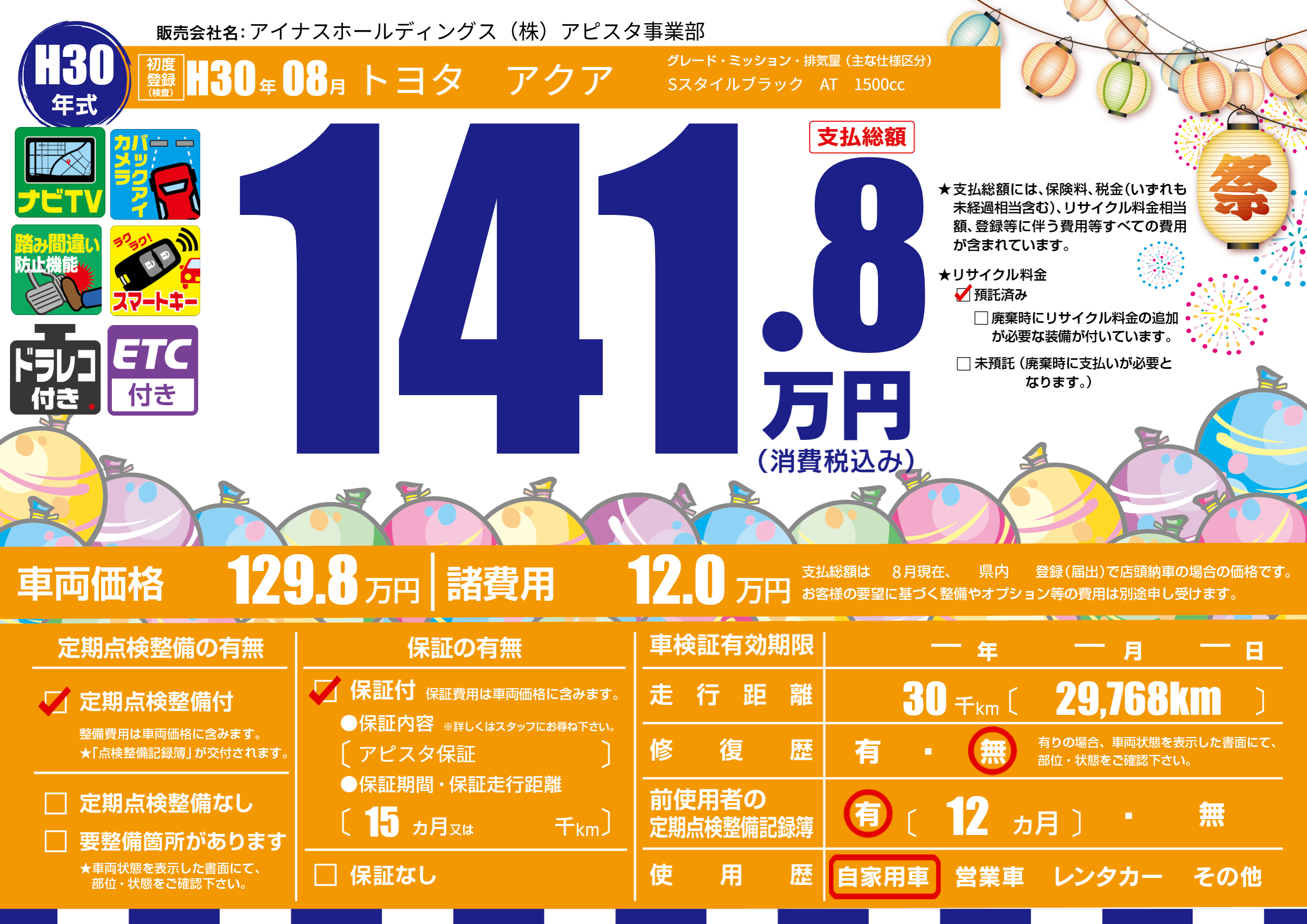 | 走行キロ | 3万km | 初年度登録 | H30年08月 |