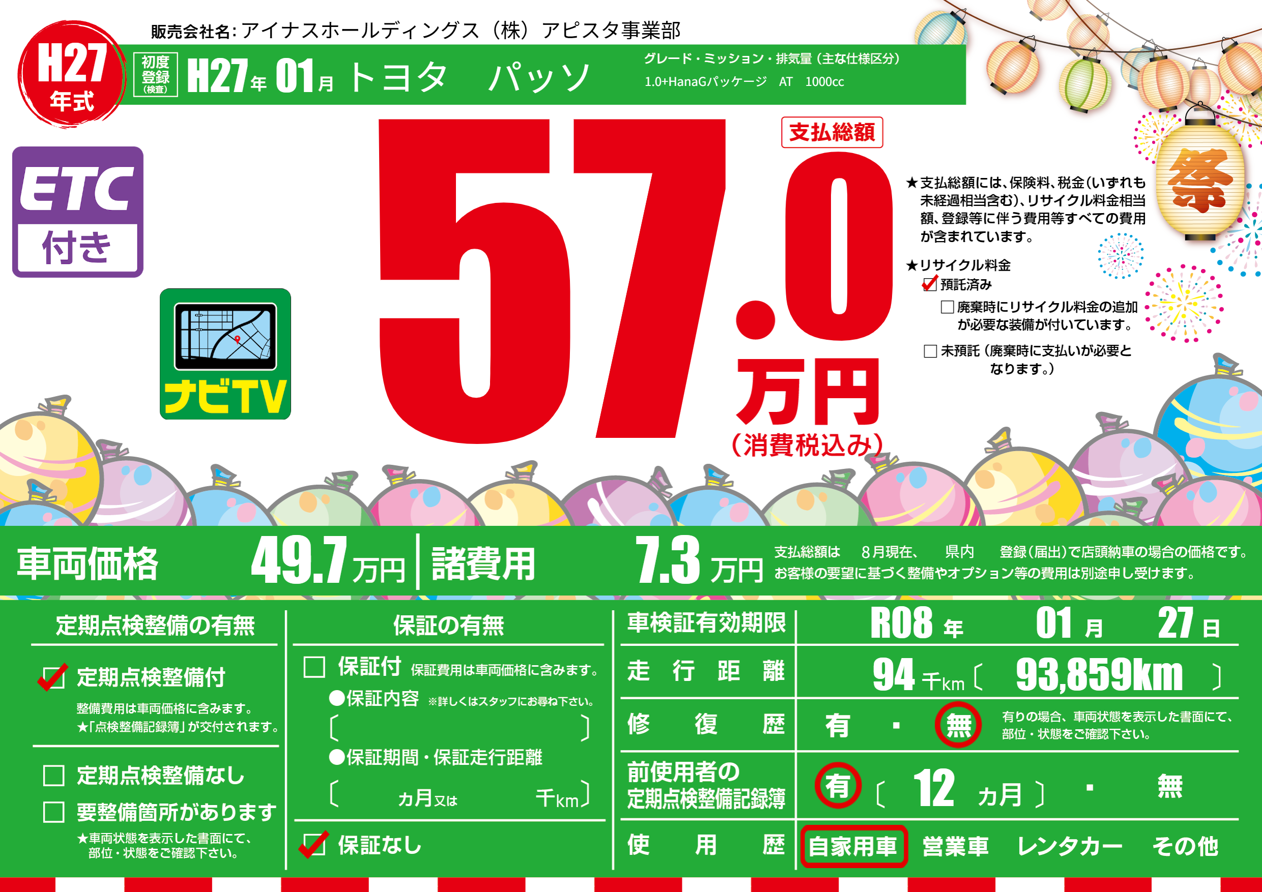 | 車名 | トヨタ パッソ | グレード ミッション 排気量 |