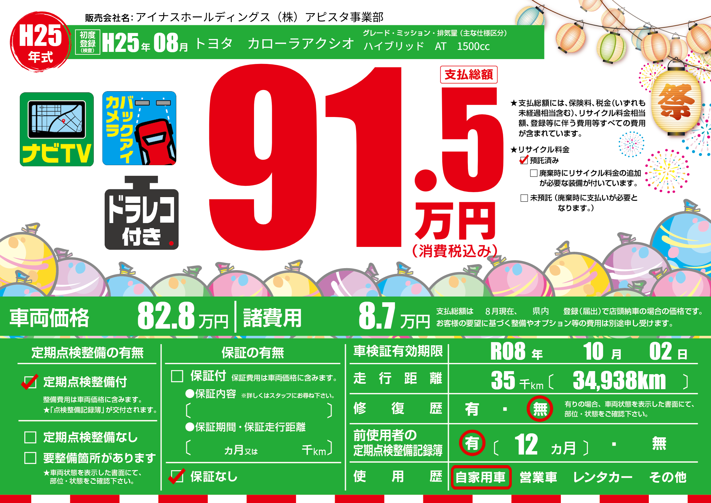 | 走行キロ | 3.5万km | 初年度登録 | H25年08月 |