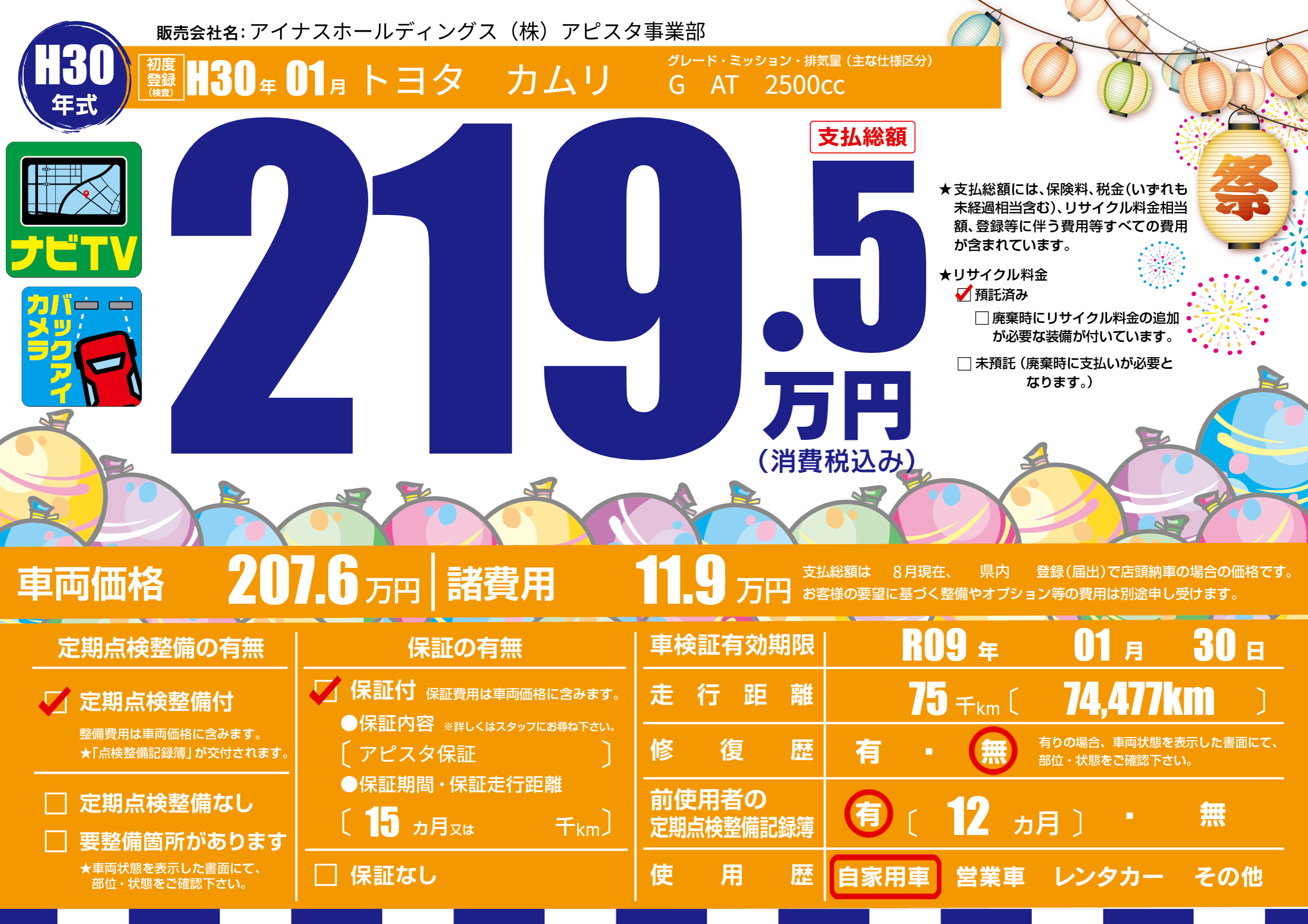 | 走行キロ | 7.5万km | 初年度登録 | H30年01月 |