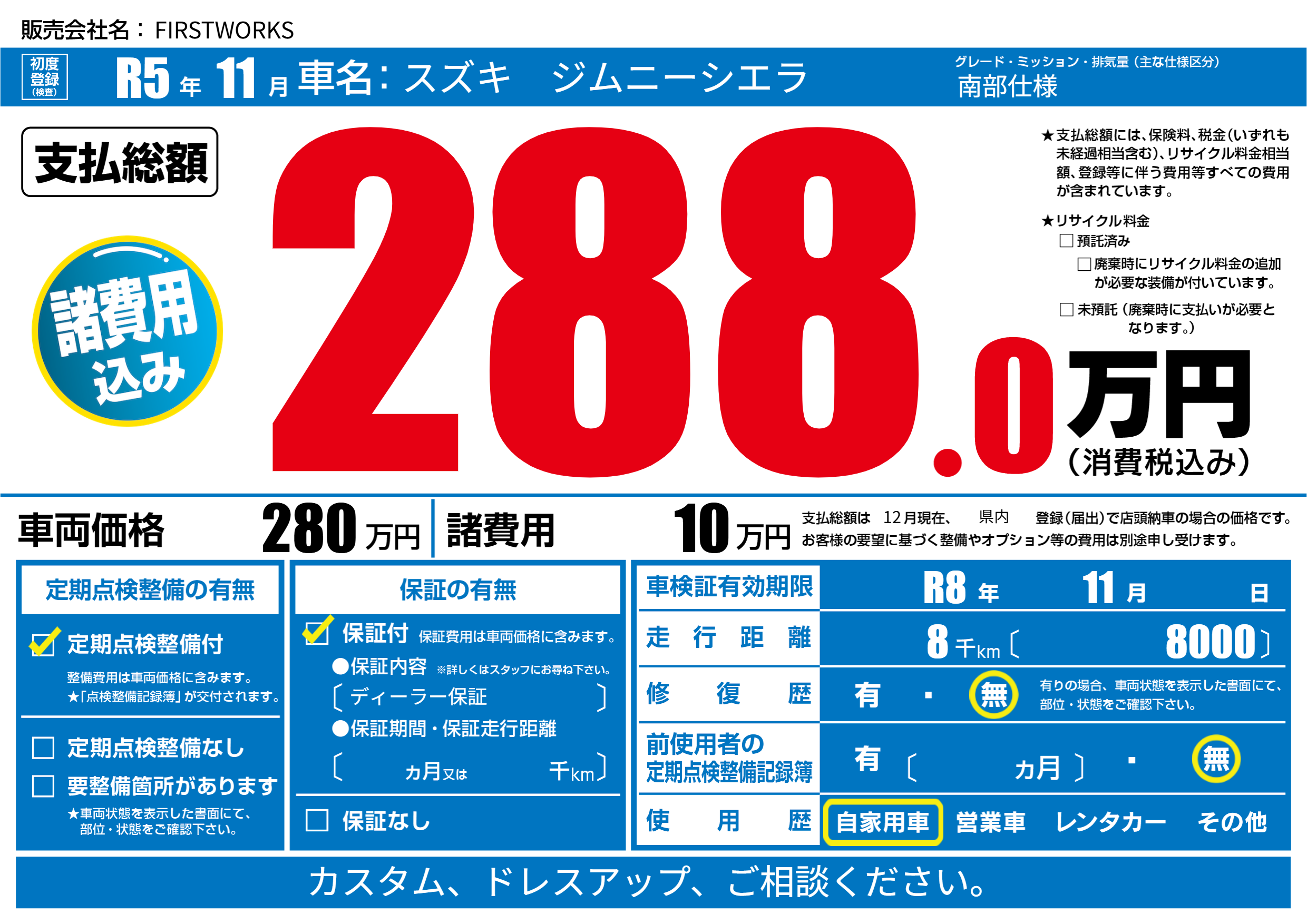 | 車検制限 | R8年 11月 - 日 | ||