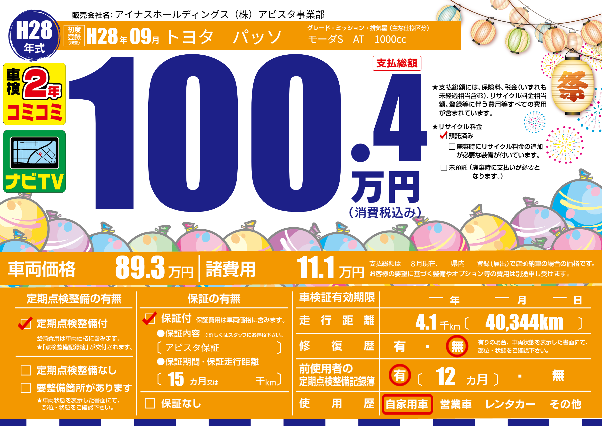 | 車名 | トヨタ パッソ | グレード ミッション 排気量 |