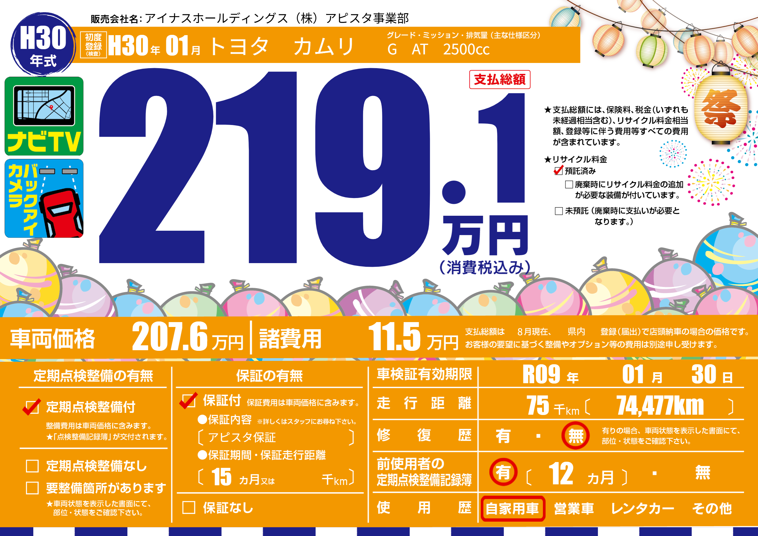 保証付き 保証内容(アピスタ保証) 15ヶ月または千km |