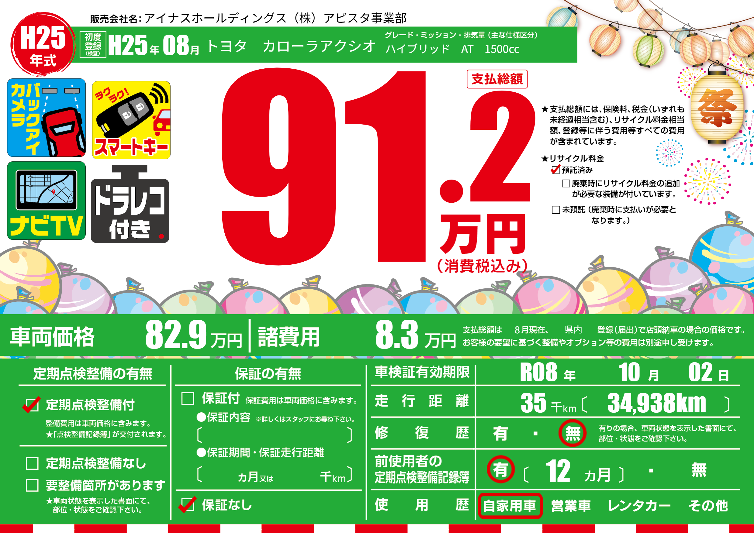 | 走行キロ | 3.5万km | 初年度登録 | H25年08月 |