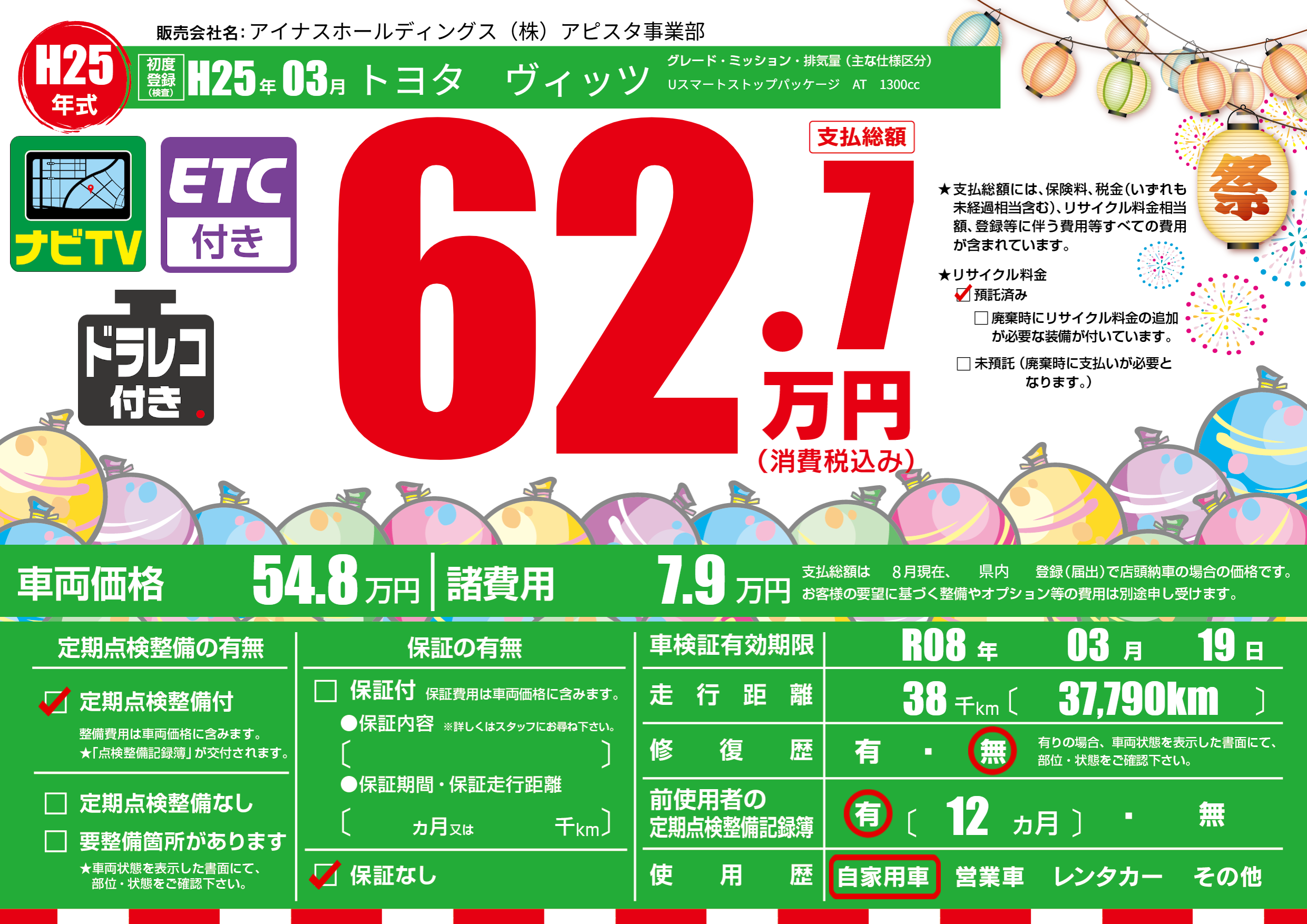| 走行キロ | 3.8万km | 初年度登録 | H25年03月 |