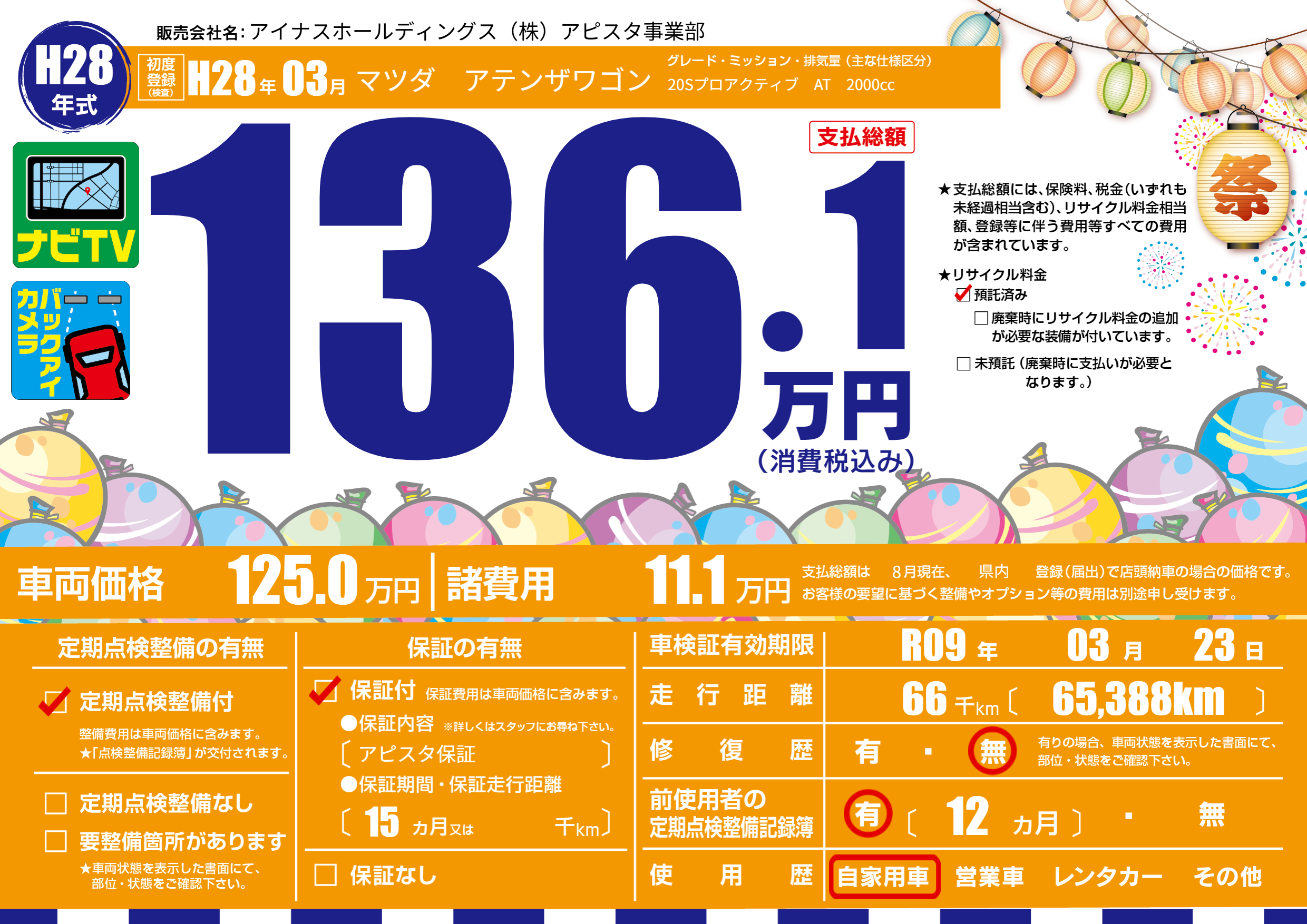 | 走行キロ | 6.6万km | 初年度登録 | H28年03月 |