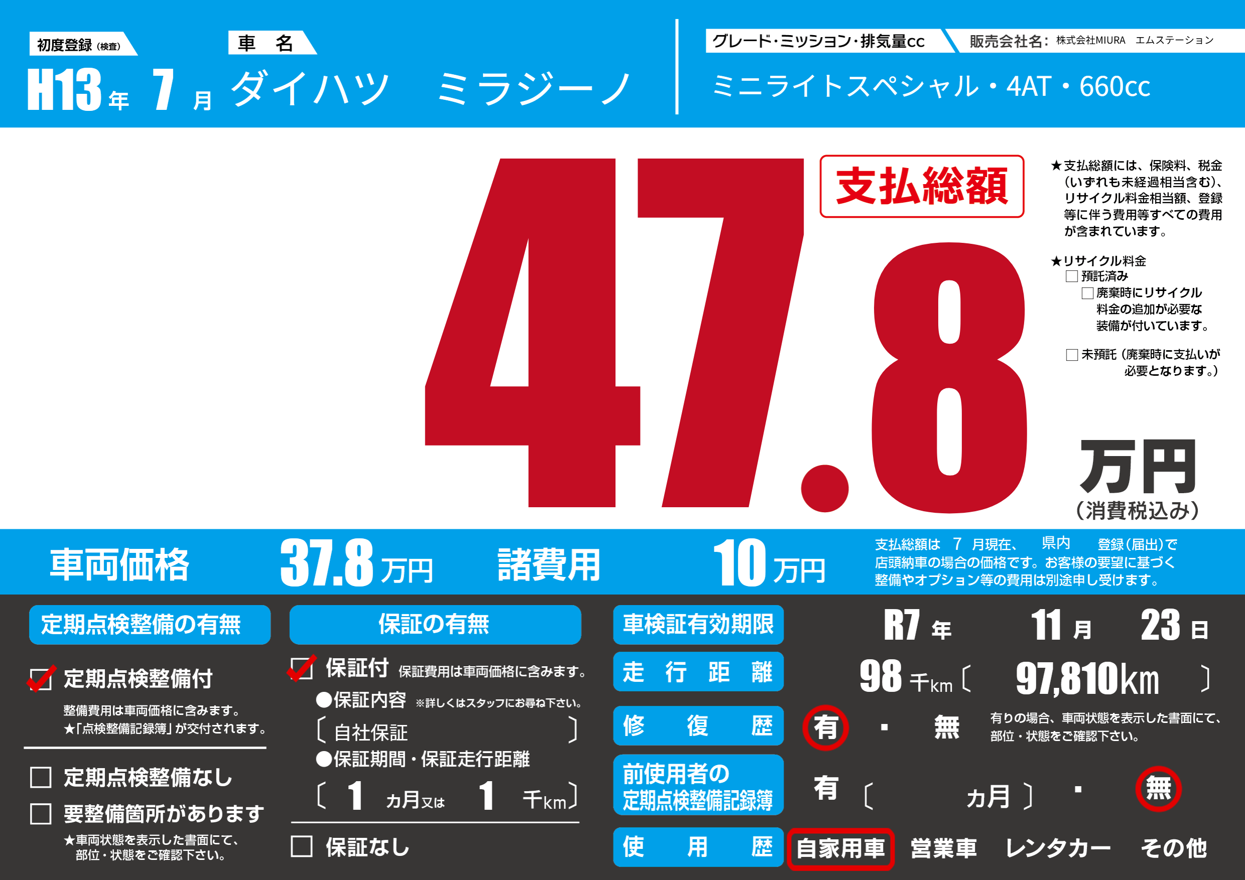 | 走行キロ | 9.8万km | 初年度登録 | H13年7月 |