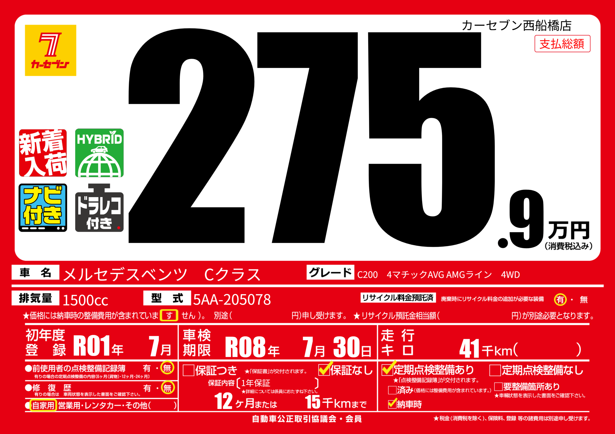 | 車名 | メルセデスベンツ Cクラス | グレード ミッション 排気量 |