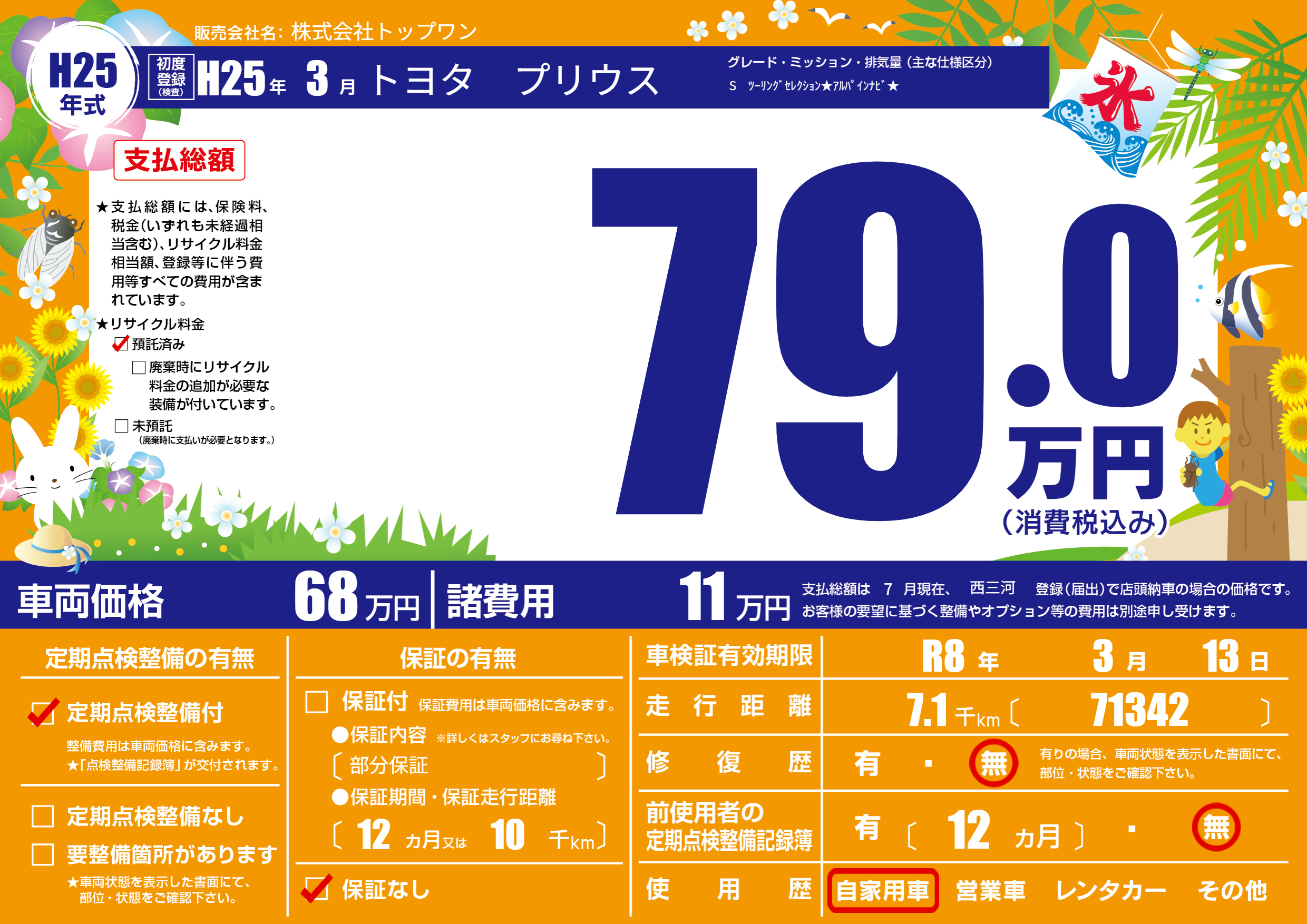 | 車名 | トヨタ プリウス | グレード ミッション 排気量 |