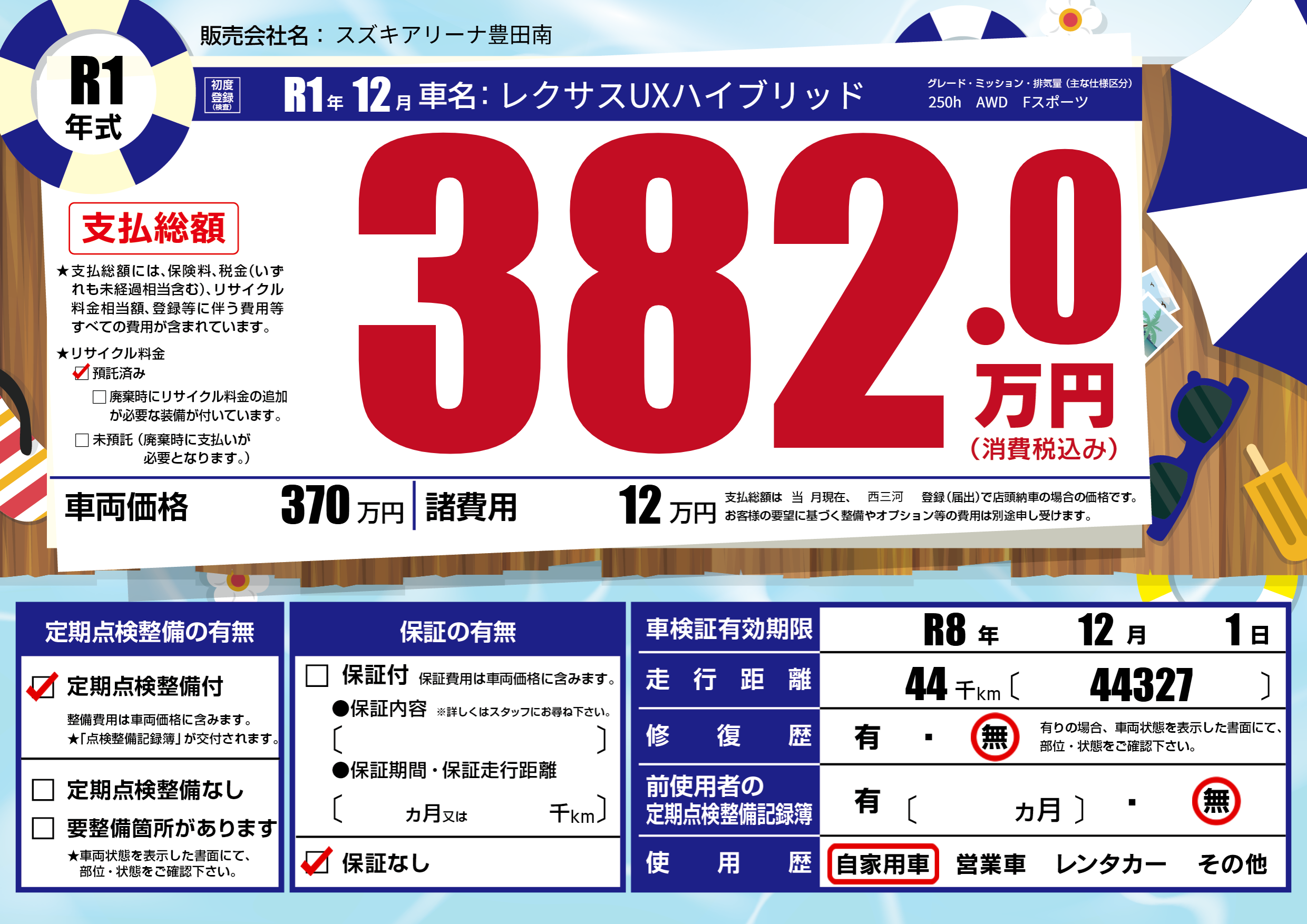 | 車名 | レクサスUXハイブリッド | グレード ミッション 排気量 |