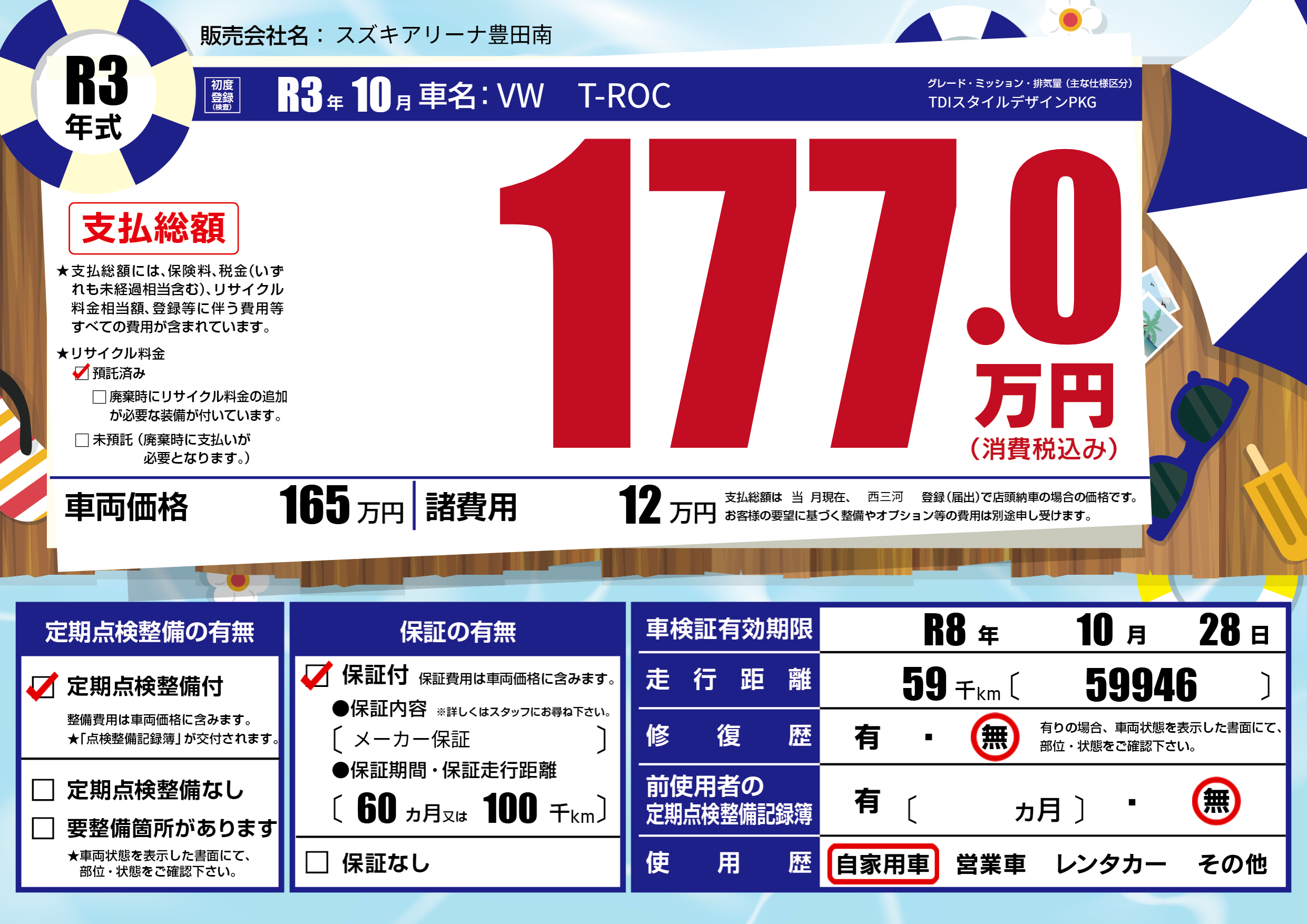 | 車名 | VW T-ROC | グレード ミッション 排気量 |