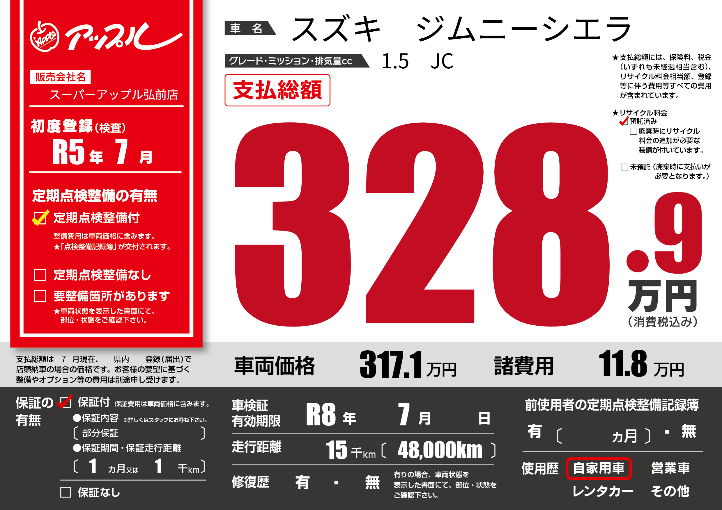 | 走行キロ | 1.5万km | 初年度登録 | R5年7月 |