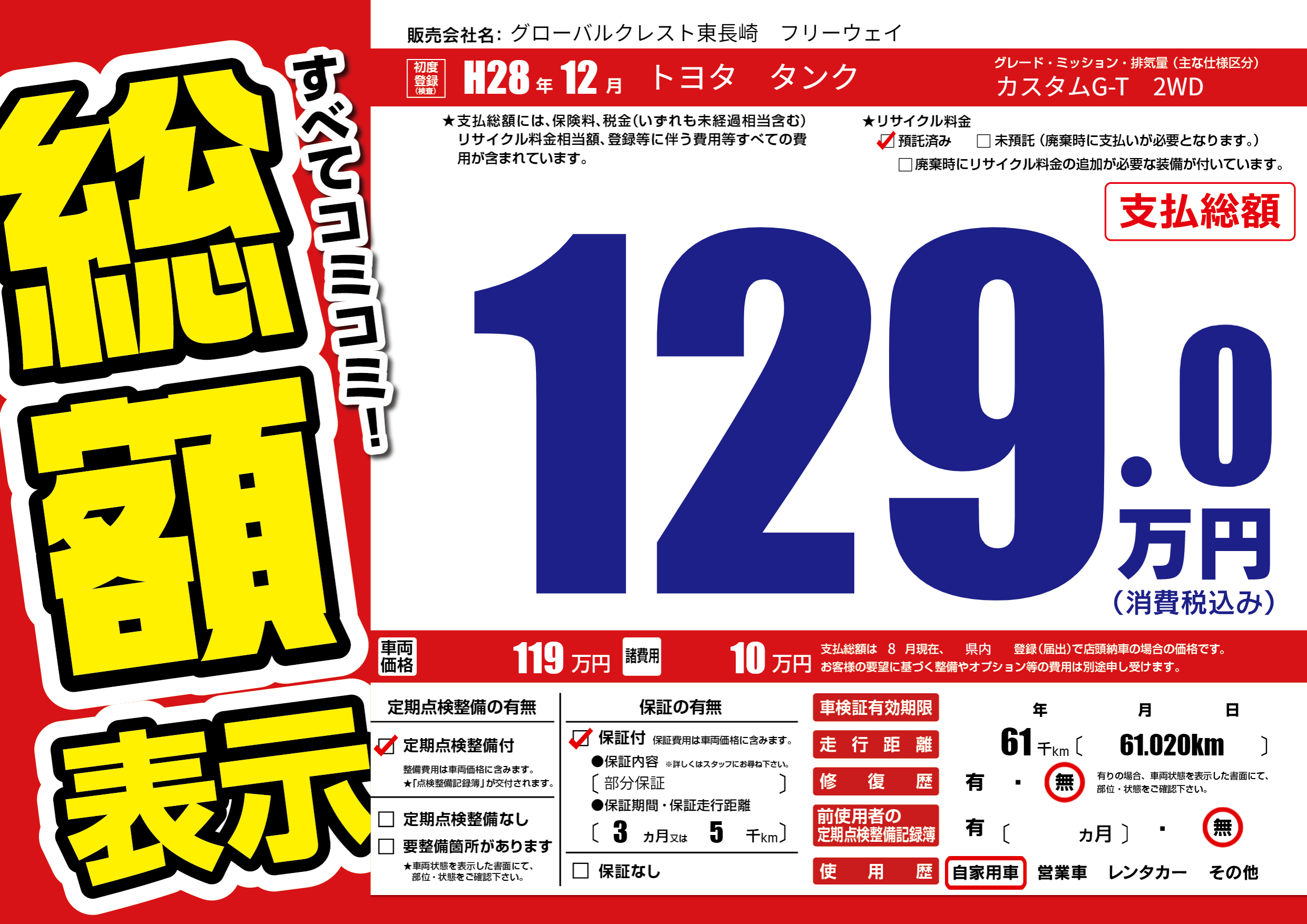 | 車名 | トヨタ タンク | グレード ミッション 排気量 |