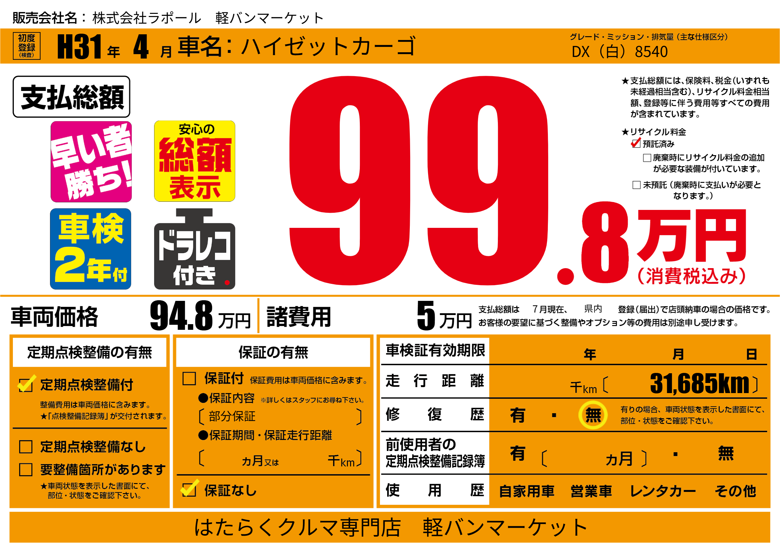 保証なし 保証内容(部分保証) ---ヶ月または()千kmまで |