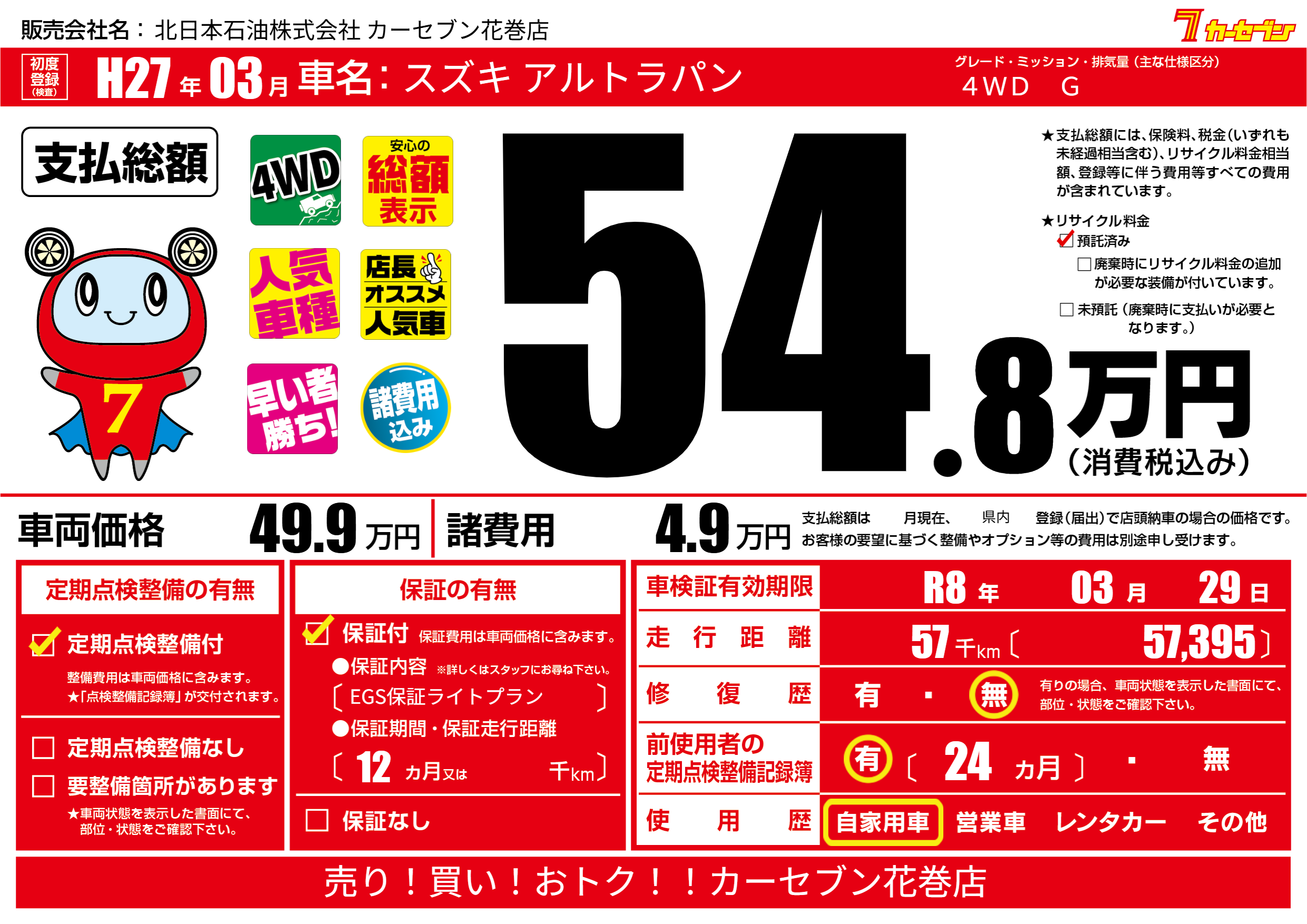 | 走行キロ | 5.7万km | 初年度登録 | H27年03月 |