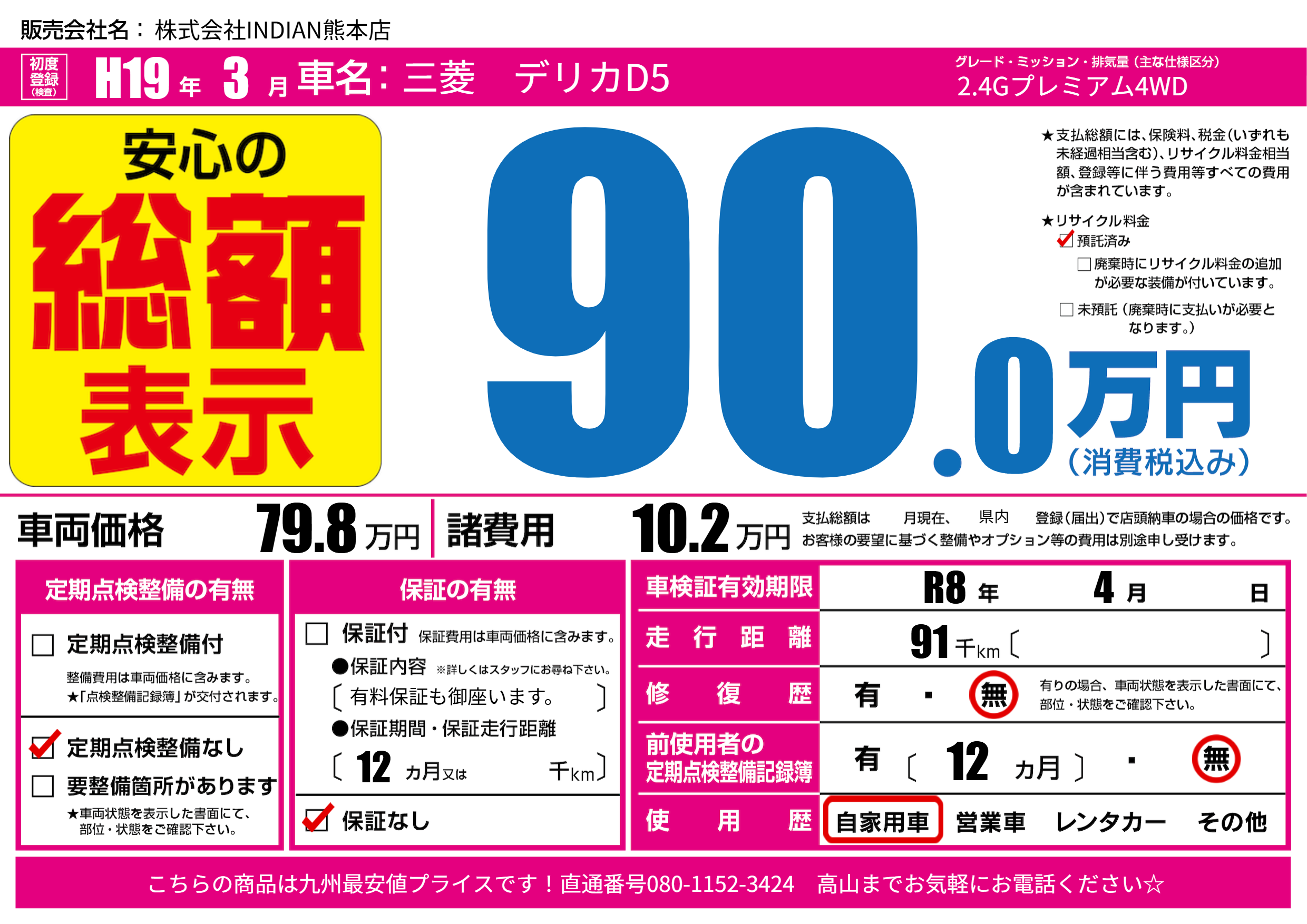 | 車名 | 三菱 デリカD5 | グレード ミッション 排気量 |