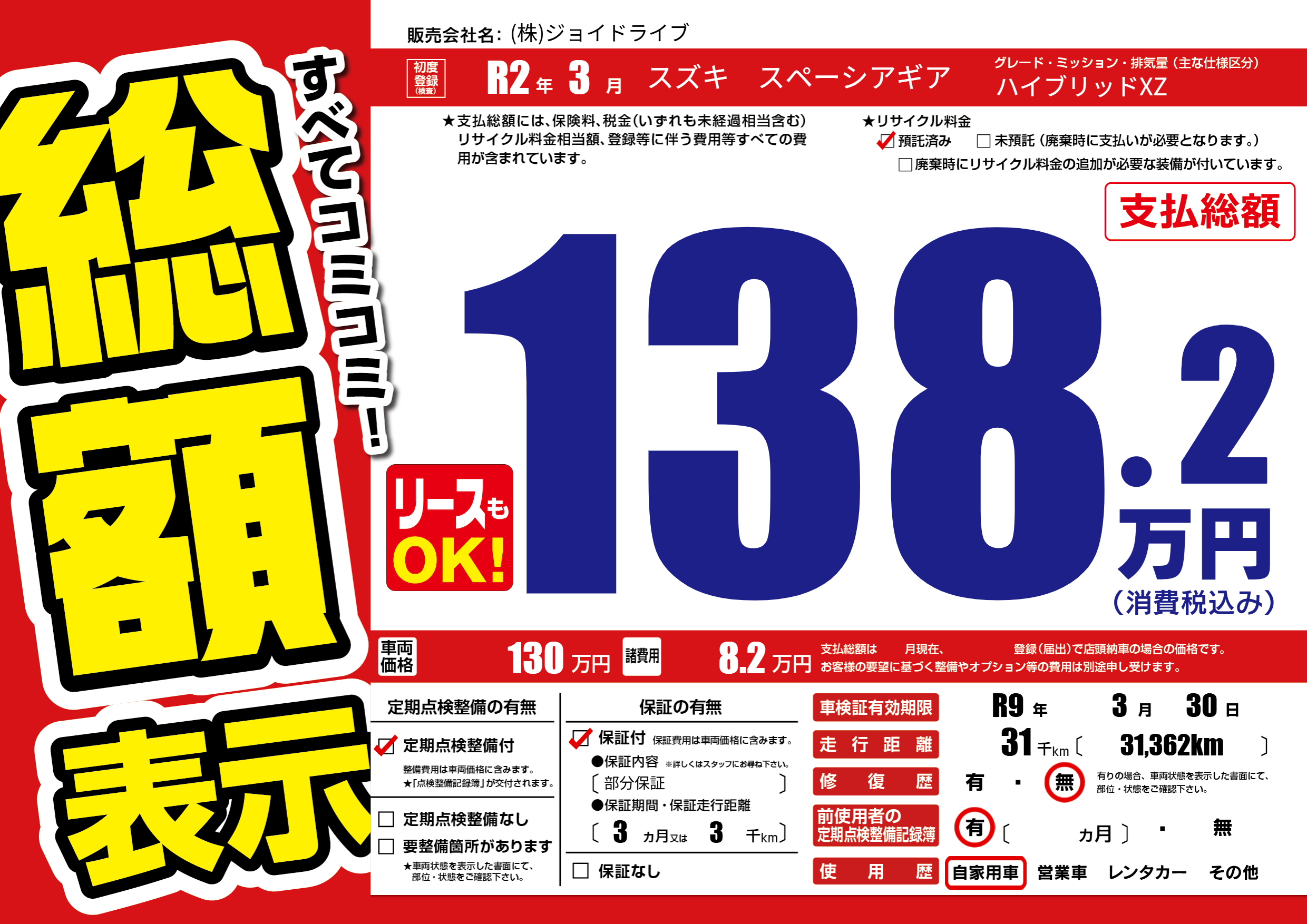 | 走行キロ | 3.1万km | 初年度登録 | R2年3月 |
