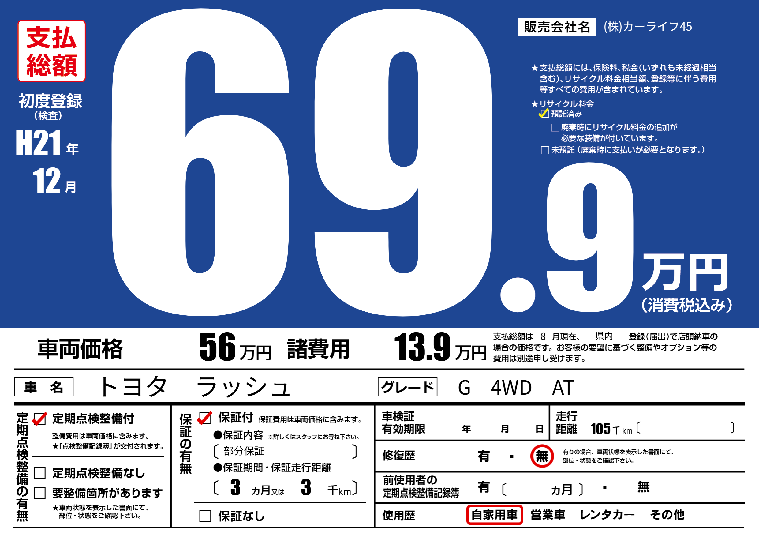 | 走行キロ | 10.5万km | 初年度登録 | H21年12月 |