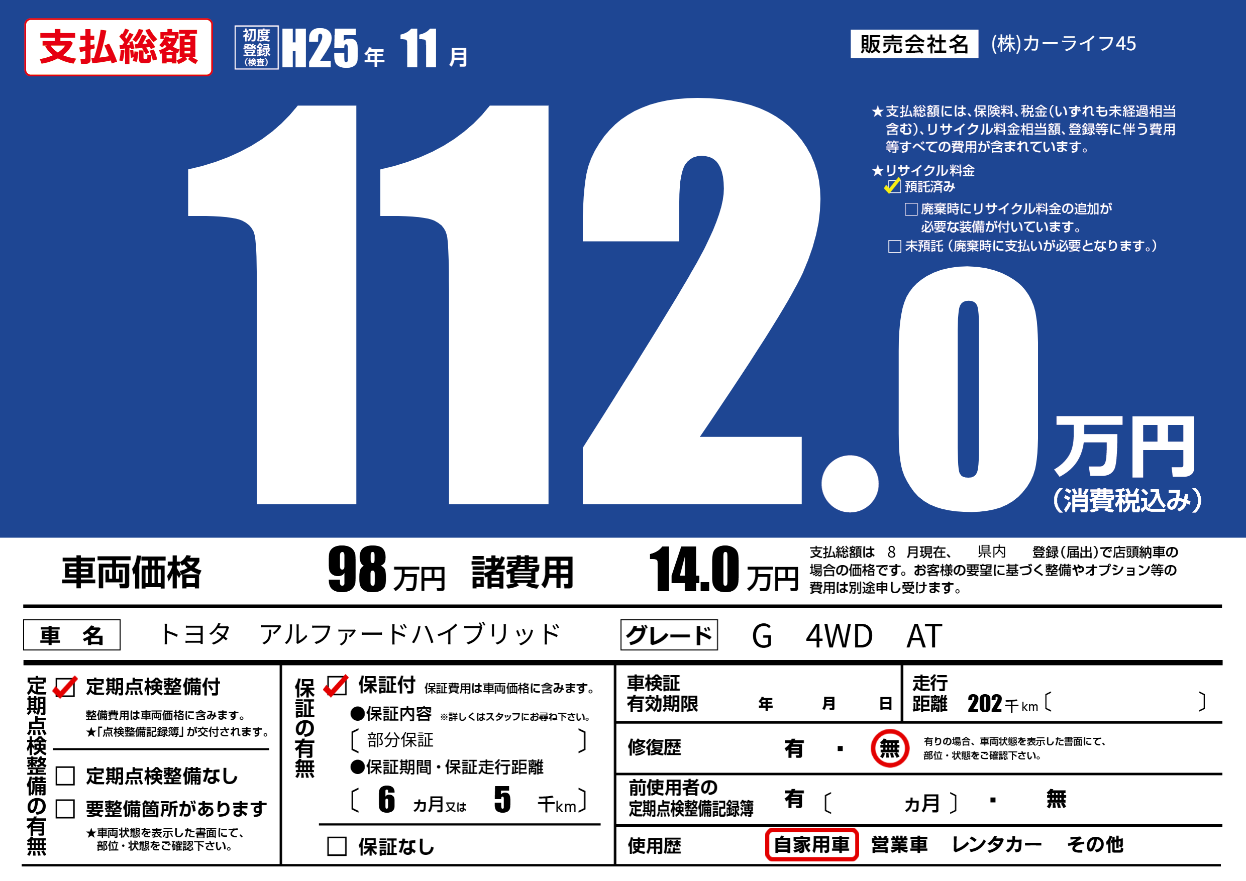 | 車名 | トヨタ アルファードハイブリッド | グレード ミッション 排気量 |
