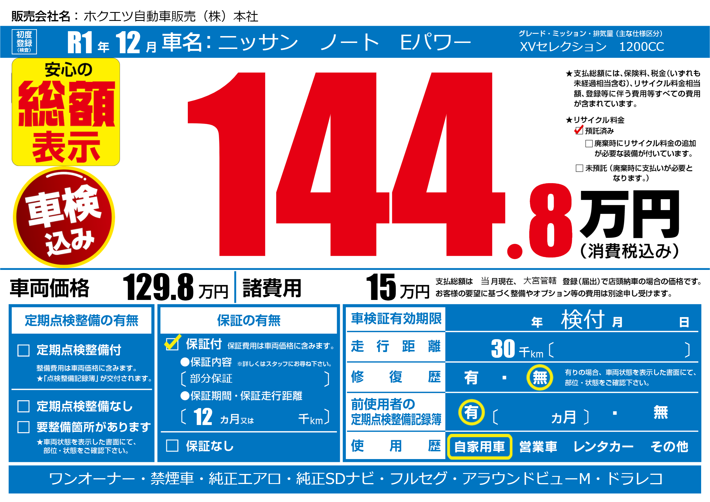 | 車名 | ニッサン ノート Eパワー | グレード ミッション 排気量 |