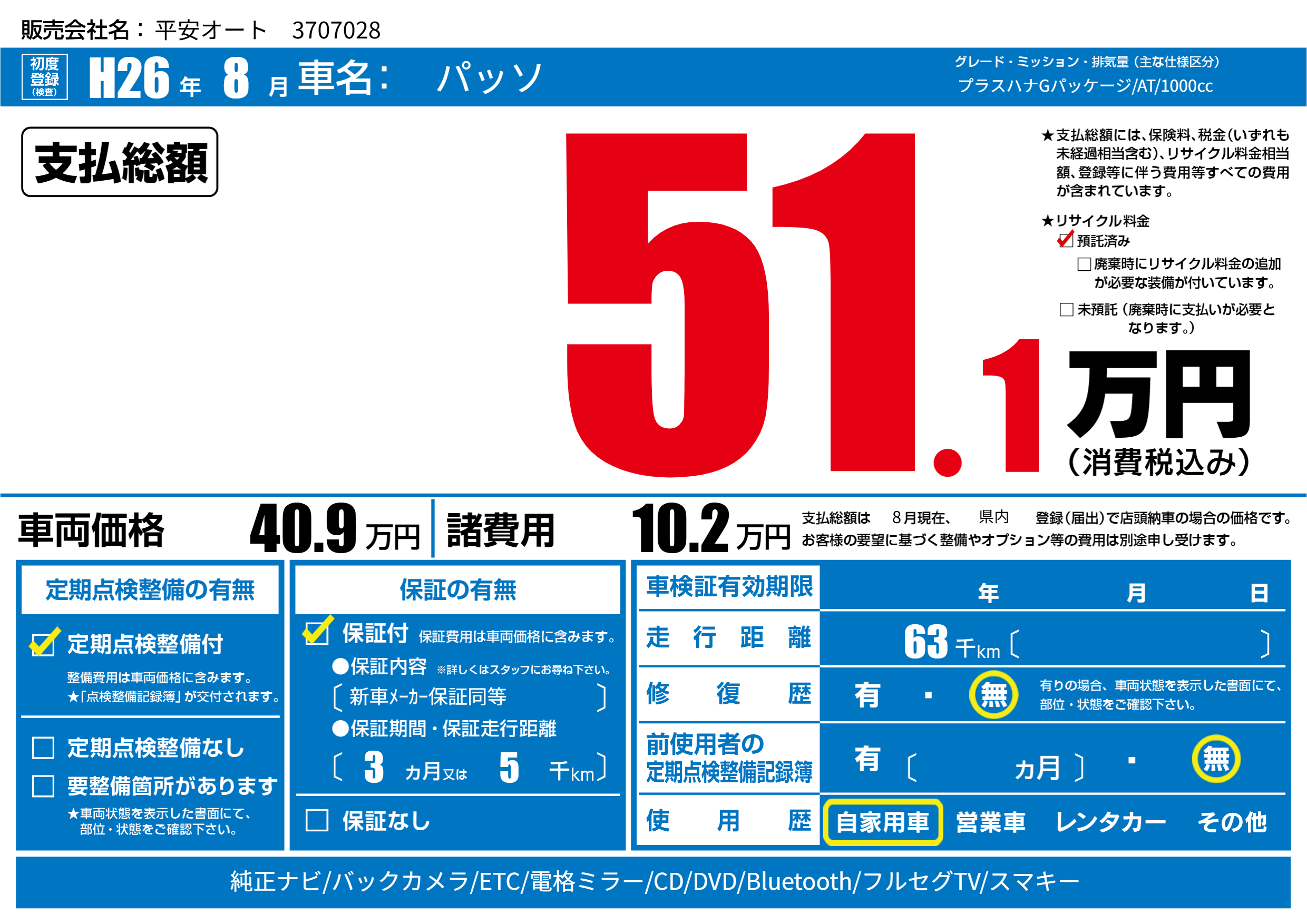 保証付き 保証内容(新車メーカー保証同等) 3ヶ月または5千km |
