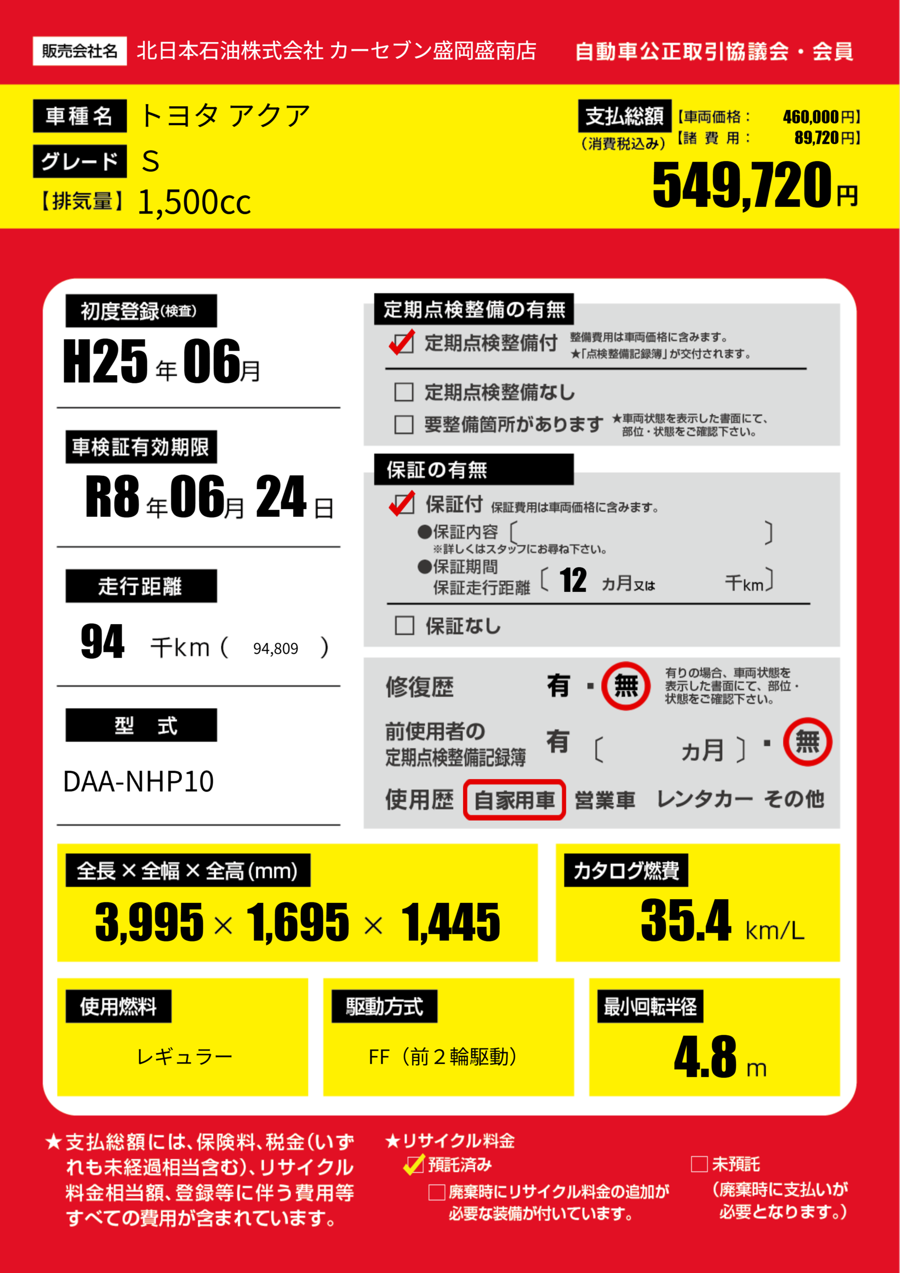 | 車名 | トヨタ アクア | グレード ミッション 排気量 |